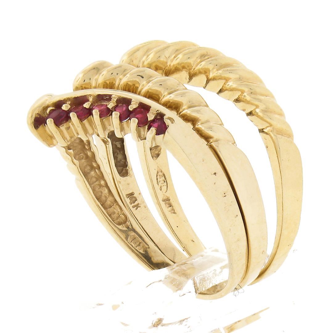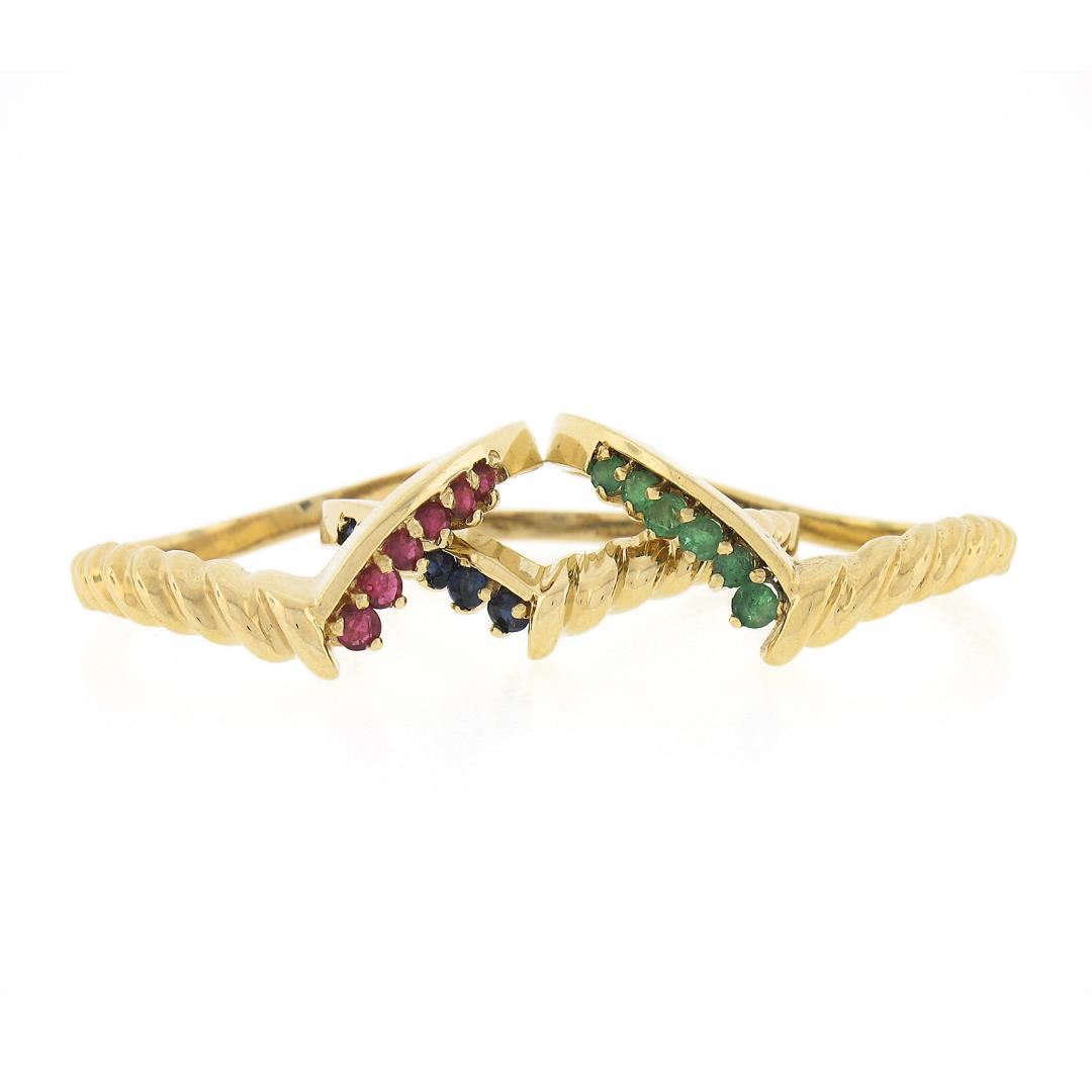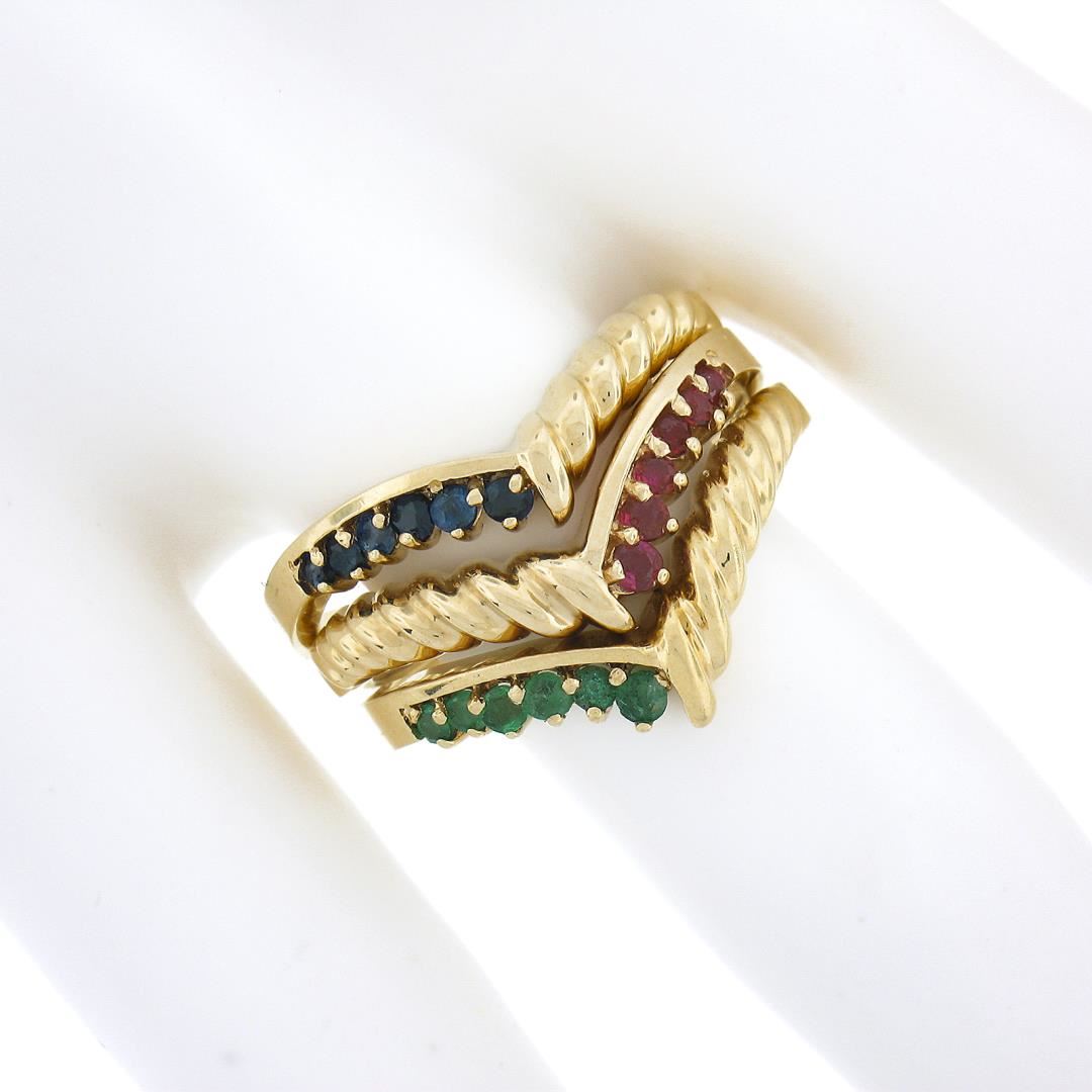 A solid 14k yellow gold stackable set of 3 band rings, featuring 6 round brilliant cut natural rubies (0.15ctw ), 6 round brilliant cut natural emeralds (0.12ctw), & 6 round brilliant cut natural sapphires (0.15ctw). The ring is size 8.0, weighs a total of 6.38 grams, and measures 5.6mm wide.