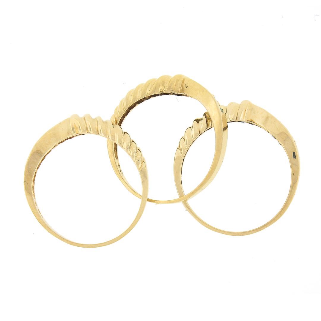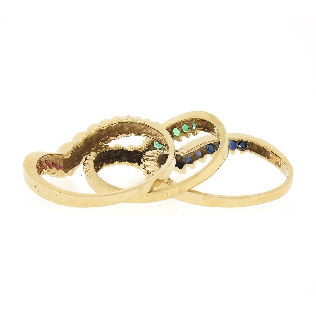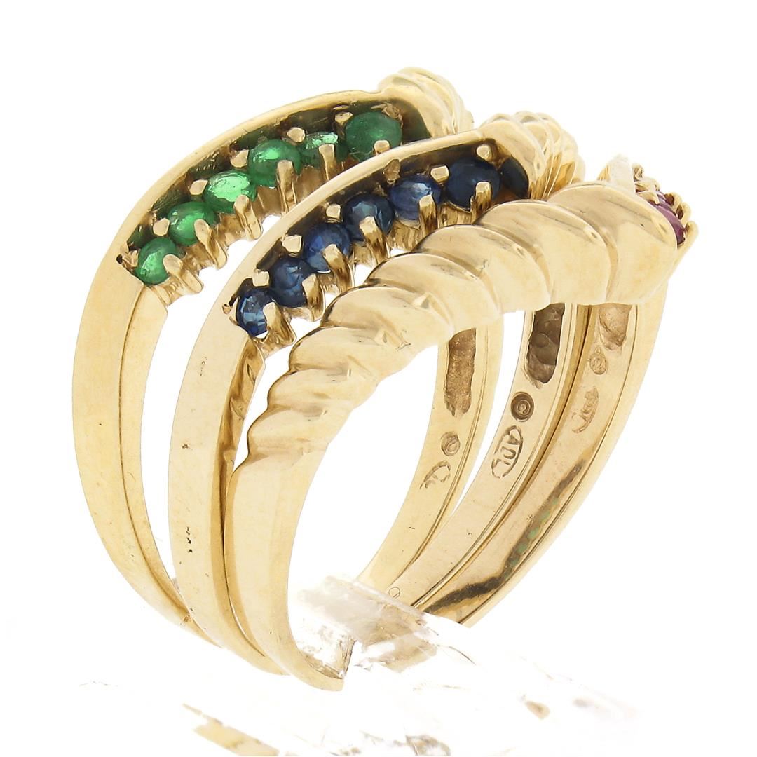 A solid 14k yellow gold stackable set of 3 band rings, featuring 6 round brilliant cut natural rubies (0.15ctw ), 6 round brilliant cut natural emeralds (0.12ctw), & 6 round brilliant cut natural sapphires (0.15ctw). The ring is size 8.0, weighs a total of 6.38 grams, and measures 5.6mm wide.