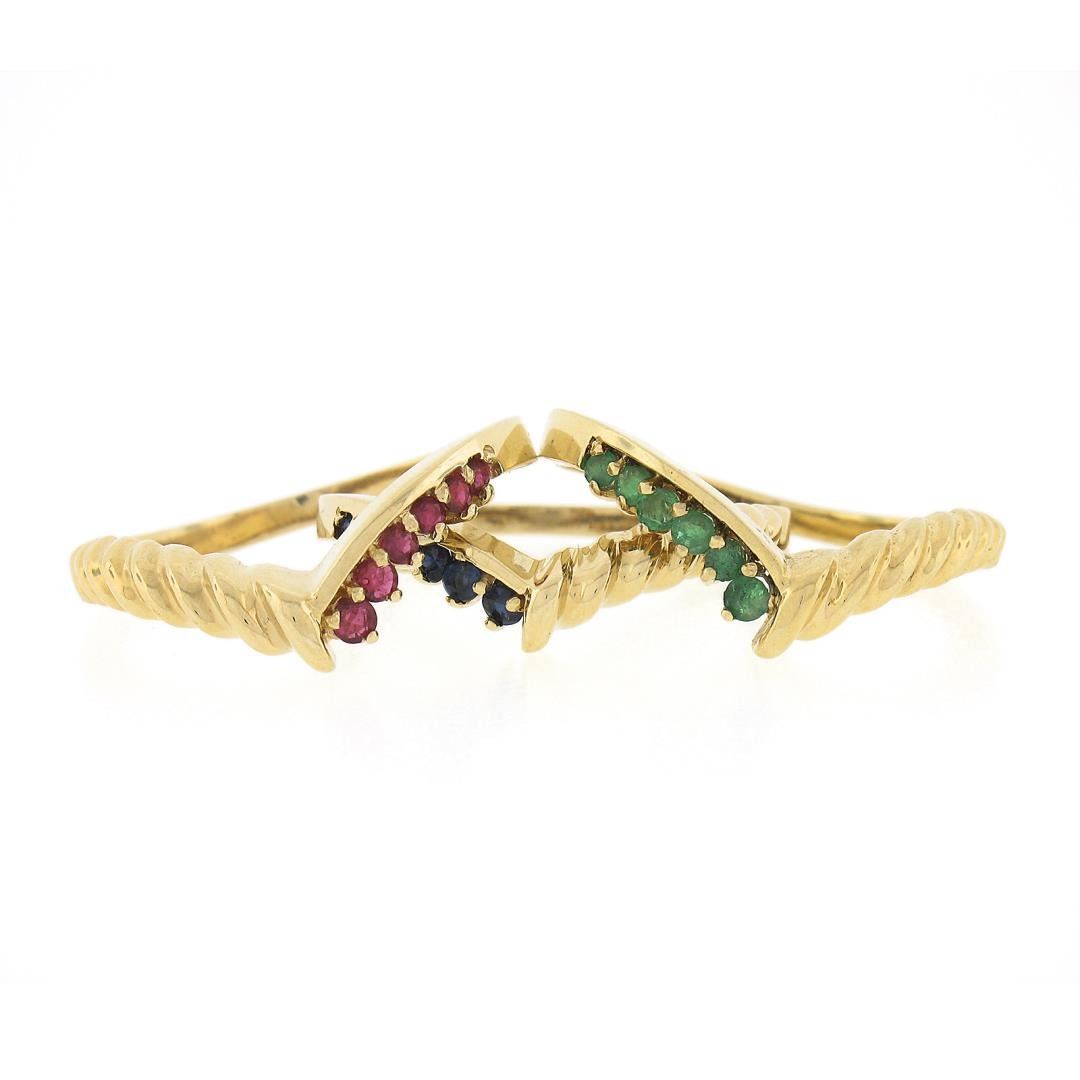 A solid 14k yellow gold stackable set of 3 band rings, featuring 6 round brilliant cut natural rubies (0.15ctw ), 6 round brilliant cut natural emeralds (0.12ctw), & 6 round brilliant cut natural sapphires (0.15ctw). The ring is size 8.0, weighs a total of 6.38 grams, and measures 5.6mm wide.