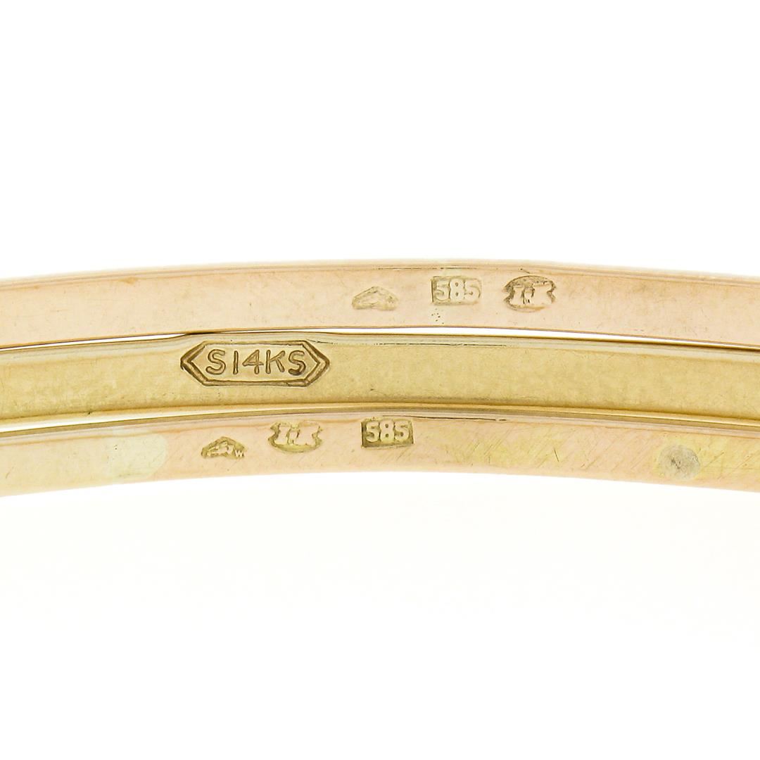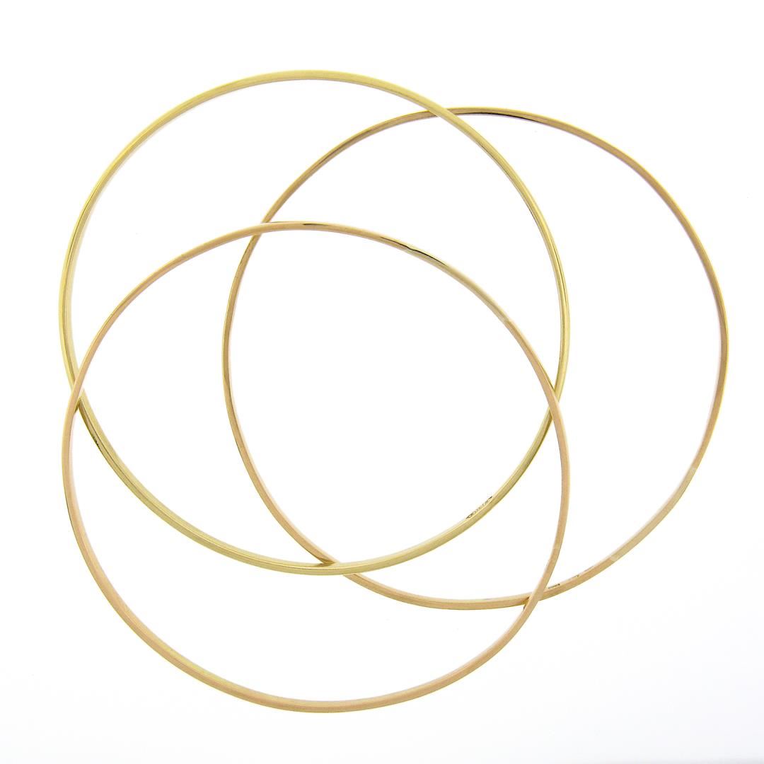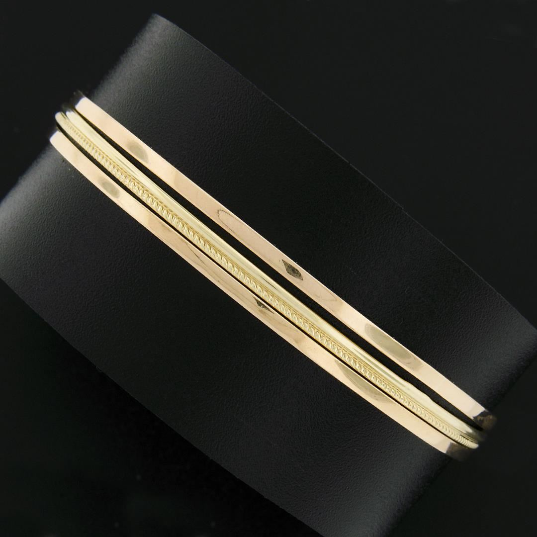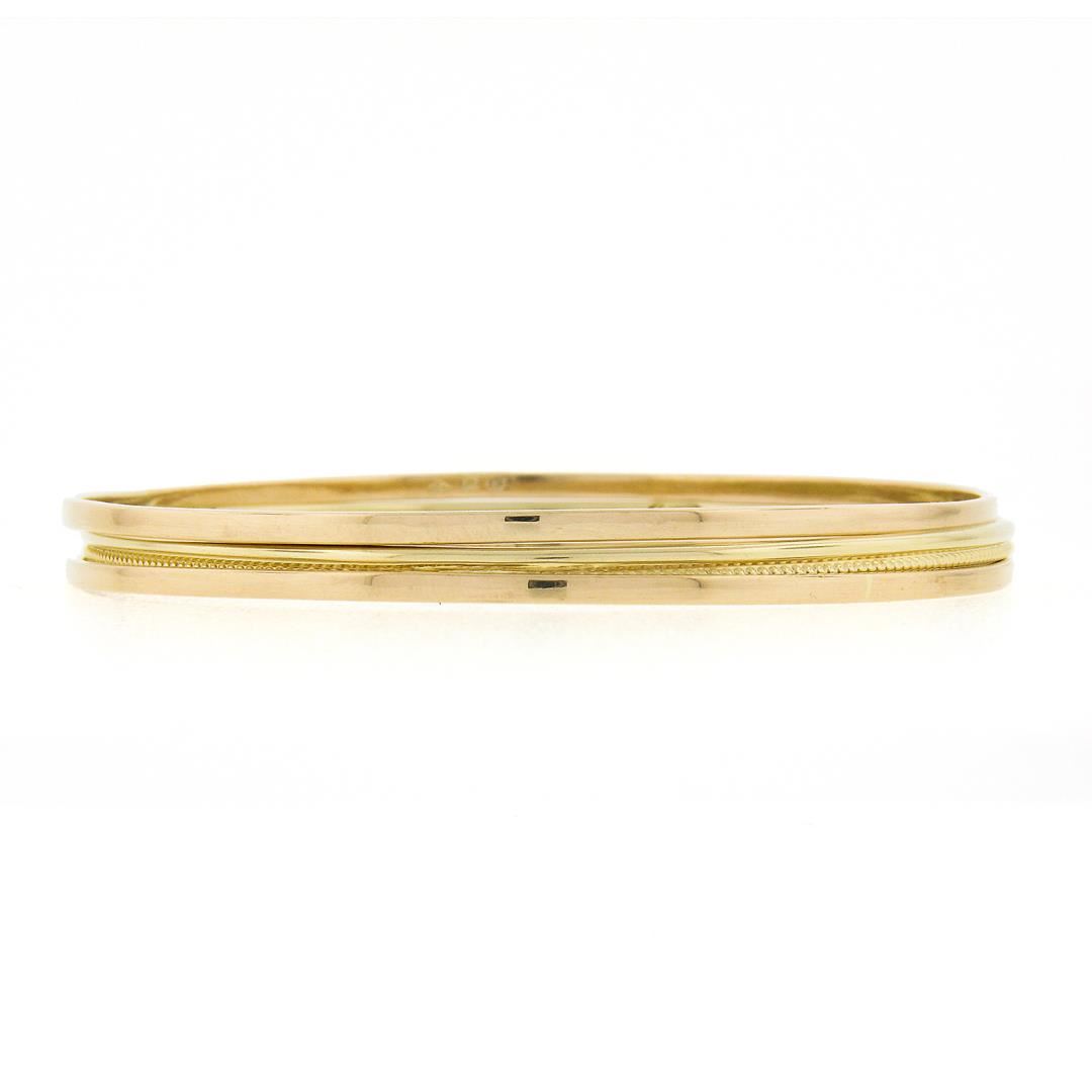 A set of 3 14k yellow gold slip on stack bangle bracelets. it weighs a total of 18.61 grams, measures (2) 2mm & (1) 2.6mm wide, and measures 7.5 inches in length.