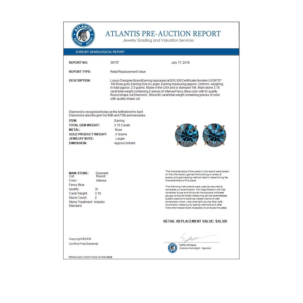 REF-379A3X -36707 ---- 3.15 CTW Certified Intense Blue SI Diamond Solitaire Stud Earrings 10K Rose Gold ---- Luxury Designer Brand Earring Appraised at $30,300 Certificate Number US36707 10k Rose gold, Earring Size is Larger, Earring measuring approx. Uniform, weighing in total approx. 2.5 grams. Made in the USA and is stamped 10k, Main stone 3.15 carat total weight containing 2 pieces of Intense Fancy Blue color with SI quality Round shape cut Diamond , Stone #2 carat total weight containing pieces of color with quality shape cut