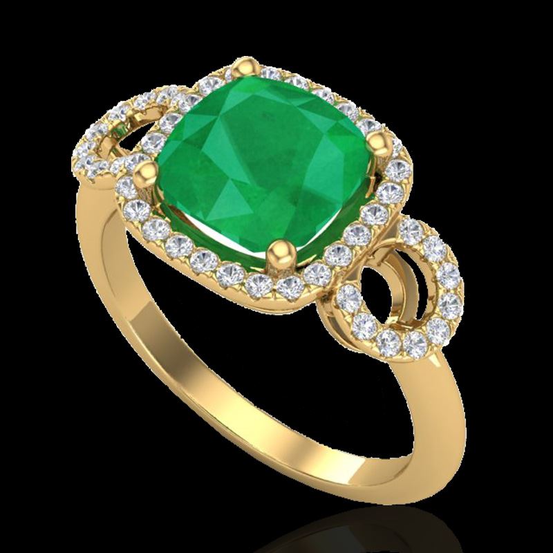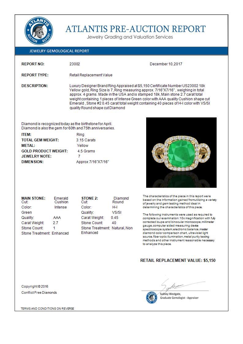 REF-78M2H -23002 ---- 3.15 CTW Emerald & Micro VS/SI Diamond Ring 18K Yellow Gold ---- Luxury Designer Brand Ring Appraised at $5,150 Certificate Number US23002 18k Yellow gold, Ring Size is 7, Ring measuring approx. 7/16"X7/16" , weighing in total approx. 4 grams. Made in the USA and is stamped 18k, Main stone 2.7 carat total weight containing 1 pieces of Intense Green color with AAA quality Cushion shape cut Emerald , Stone #2 0.45 carat total weight containing 40 pieces of H-I color with VS/SI quality Round shape cut Diamond