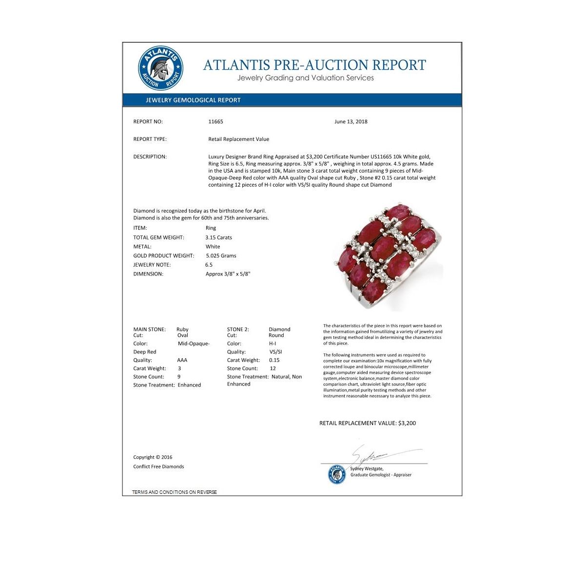 REF-48W2F -11665 ---- 3.15 CTW Ruby & Diamond Ring 10K White Gold ---- Luxury Designer Brand Ring Appraised at $3,200 Certificate Number US11665 10k White gold, Ring Size is 6.5, Ring measuring approx. 3/8" x 5/8" , weighing in total approx. 4.5 grams. Made in the USA and is stamped 10k, Main stone 3 carat total weight containing 9 pieces of Mid-Opaque-Deep Red color with AAA quality Oval shape cut Ruby , Stone #2 0.15 carat total weight containing 12 pieces of H-I color with VS/SI quality Round shape cut Diamond