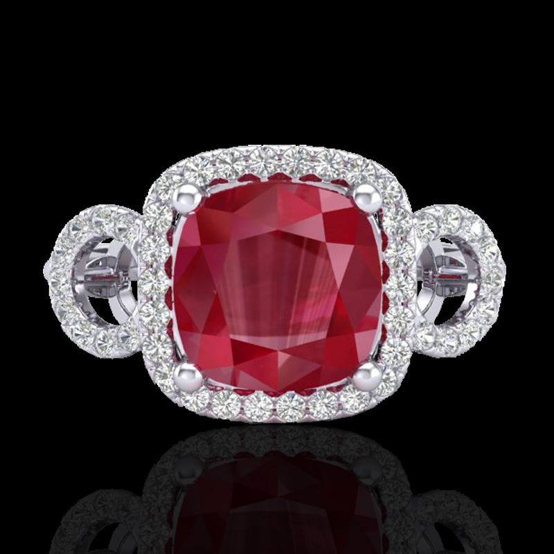 REF-76M9H -23008 ---- 3.15 CTW Ruby & Micro VS/SI Diamond Ring 18K White Gold ---- Luxury Designer Brand Ring Appraised at $5,500 Certificate Number US23008 18k White gold, Ring Size is 7, Ring measuring approx. 7/16"X7/16" , weighing in total approx. 4 grams. Made in the USA and is stamped 18k, Main stone 2.7 carat total weight containing 1 pieces of Mid-Opaque-Deep Red color with AAA quality Cushion shape cut Ruby , Stone #2 0.45 carat total weight containing 40 pieces of H-I color with VS/SI quality Round shape cut Diamond