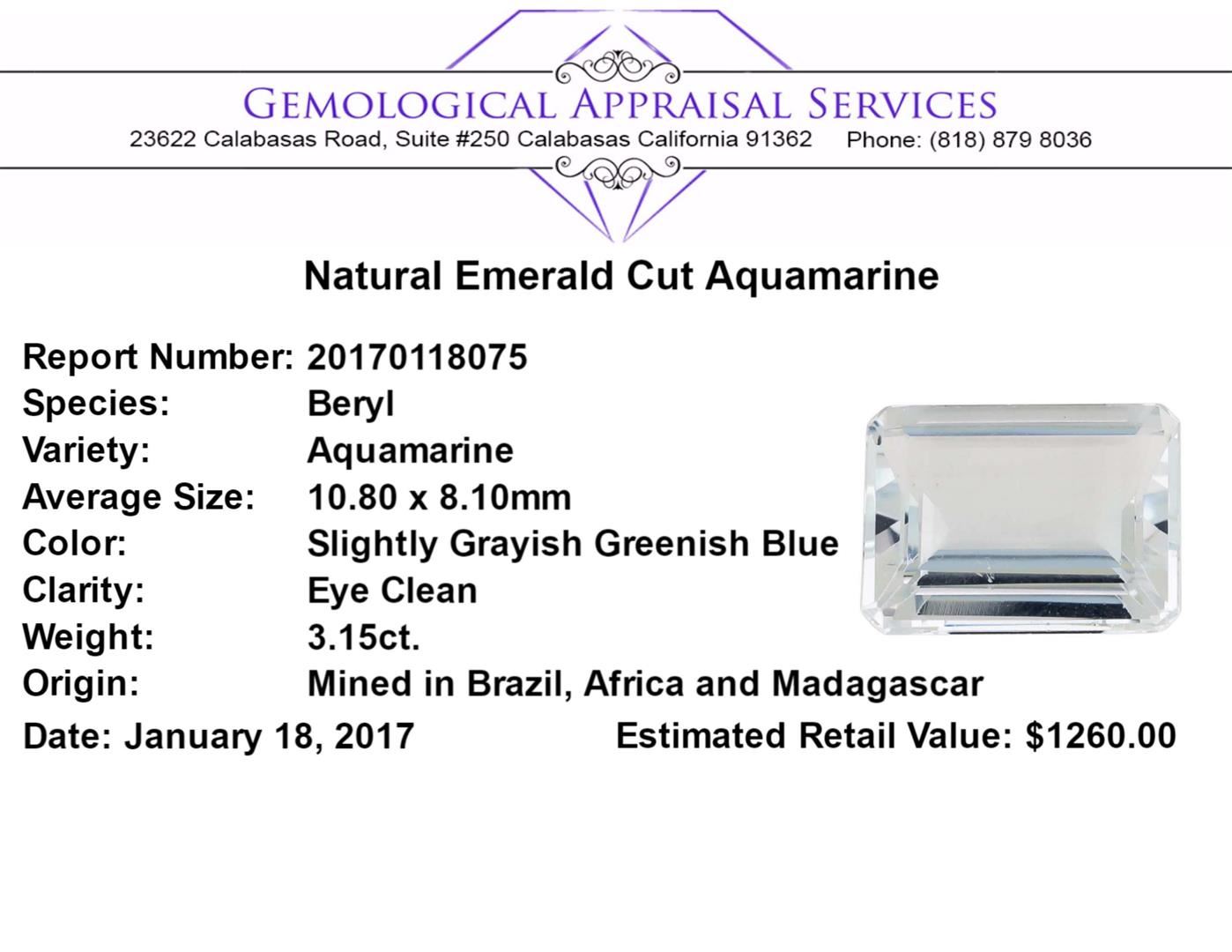 One natural emerald cut aquamarine with an exact weight of 3.15ct., clarity is eye clean, slightly grayish greenish blue. Gemological Appraisals Services estimates the retail value at $1260 GAS Appraised.