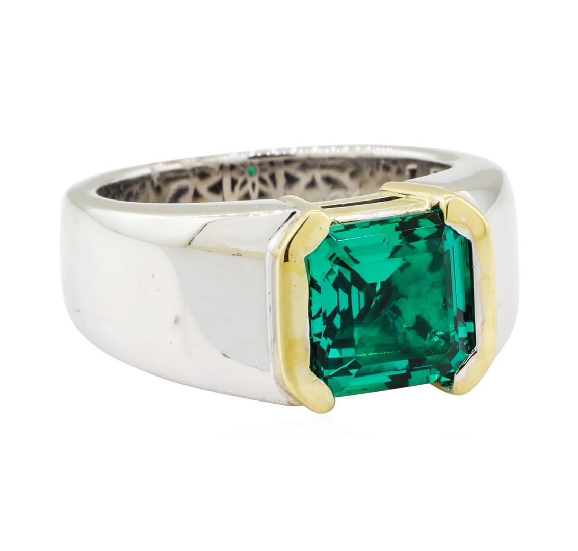 One men's ring featuring: 18KT white and yellow gold weighing 19.7 grams containing one asscher cut lab grown emerald weighing 3.15ct.