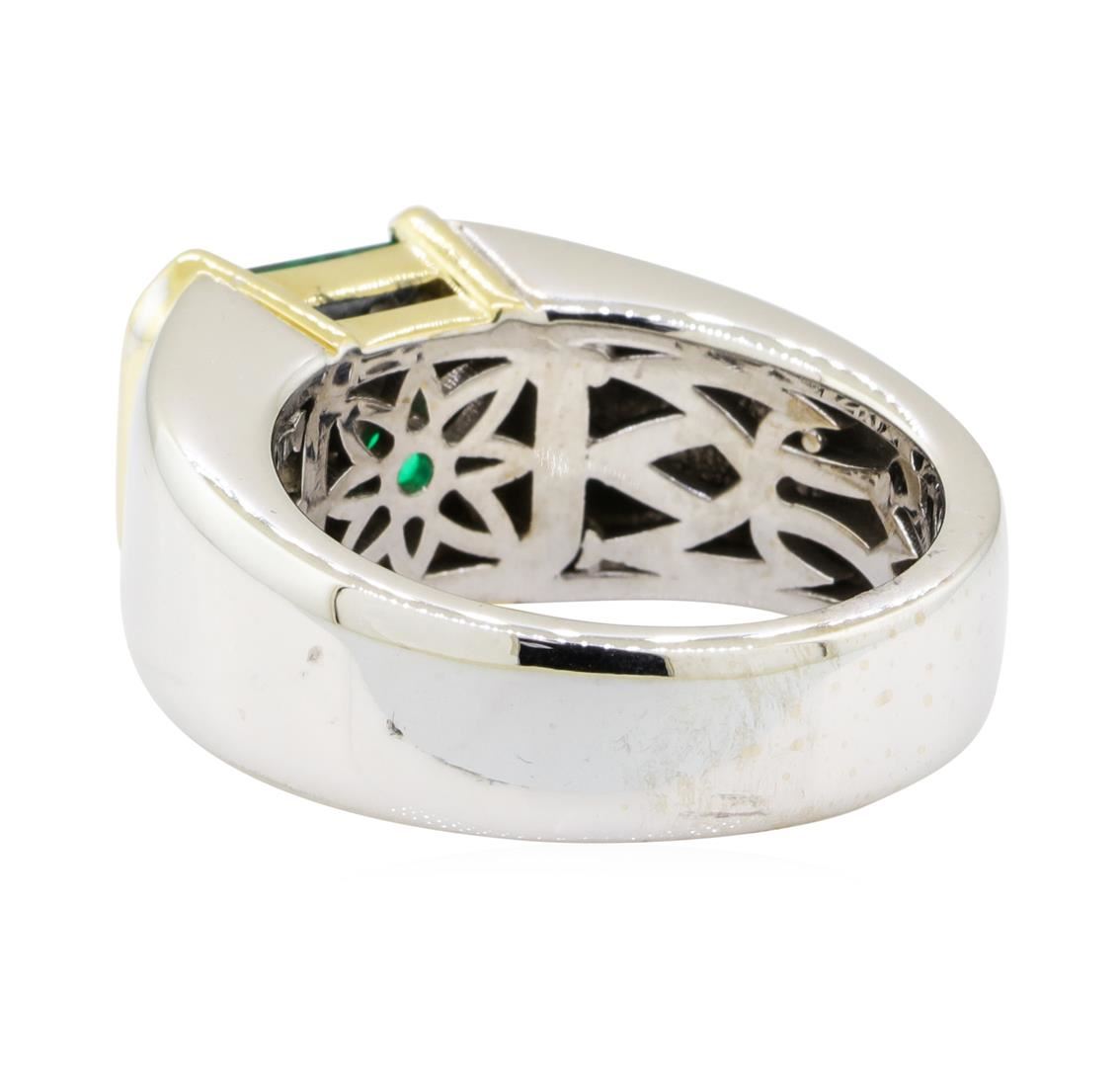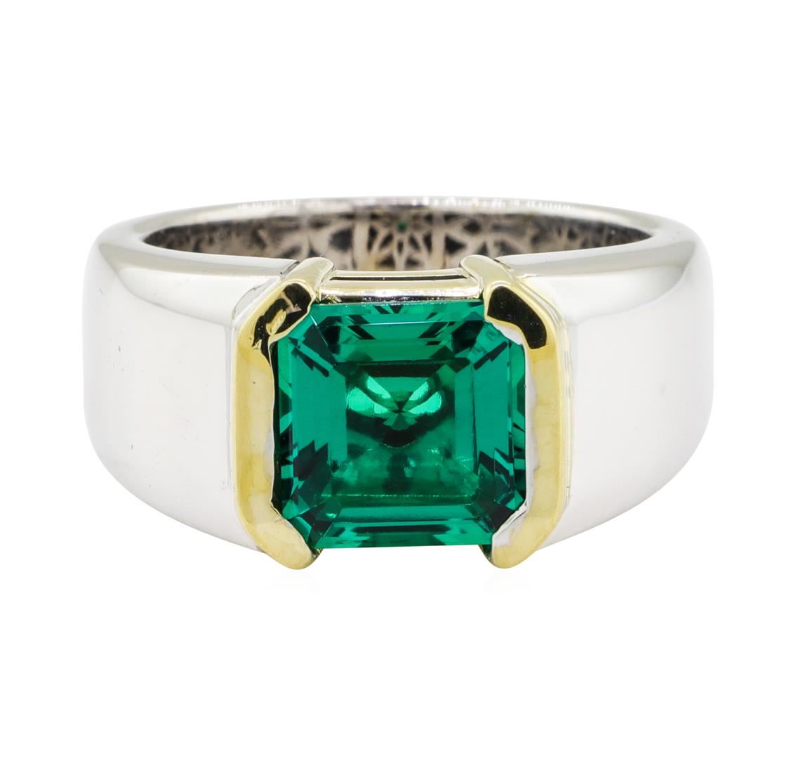 One men's ring featuring: 18KT white and yellow gold weighing 19.7 grams containing one asscher cut lab grown emerald weighing 3.15ct.