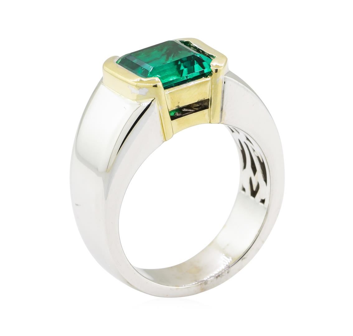 One men's ring featuring: 18KT white and yellow gold weighing 19.7 grams containing one asscher cut lab grown emerald weighing 3.15ct.