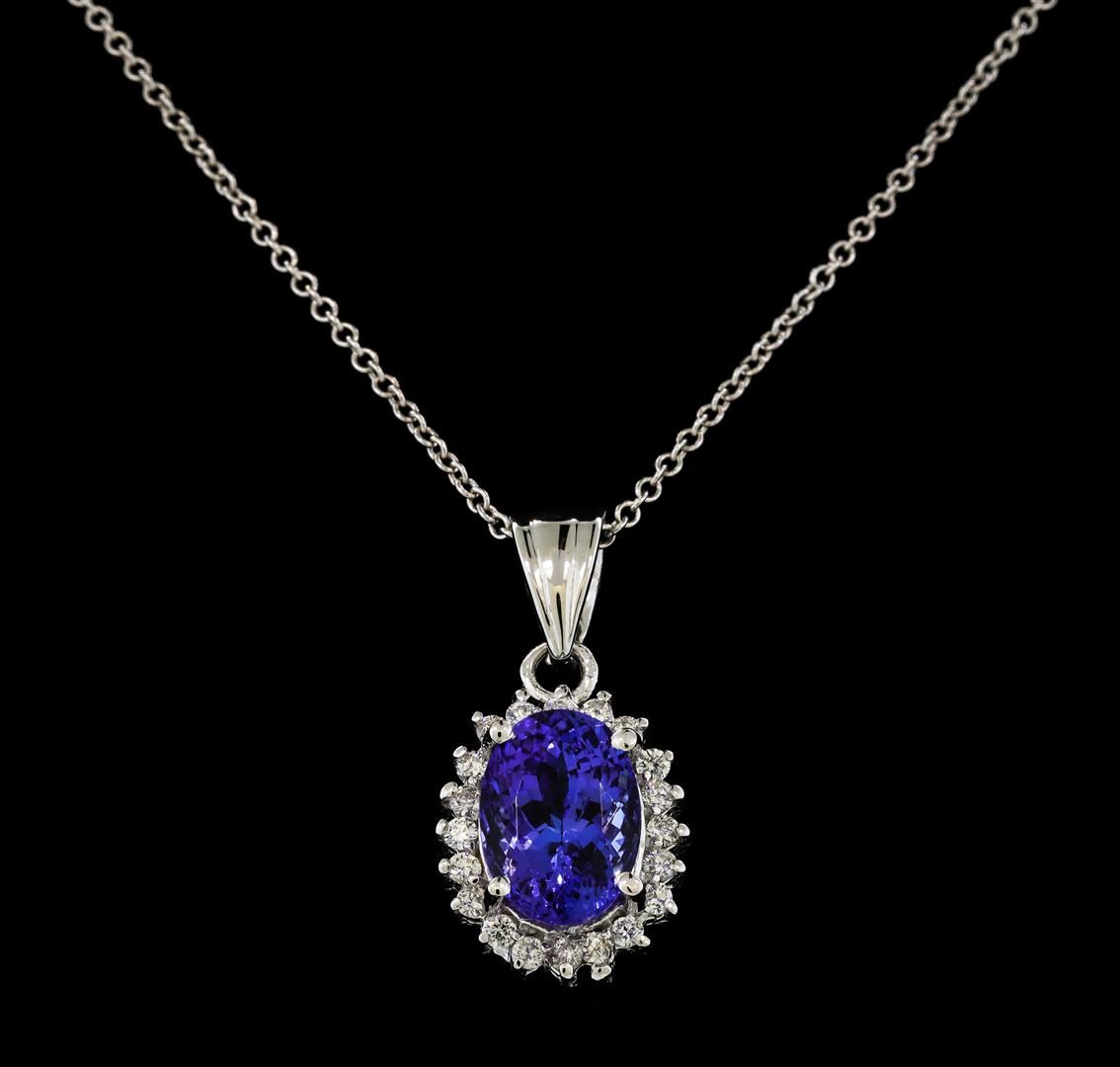 One Tanzanite and Diamond Pendant with Chain including: 14KT White Gold weighing a total of 2.70 grams, Tanzanite weighing a total of 3.15ct, and 20 Diamonds weighing a total of 0.28ctw.