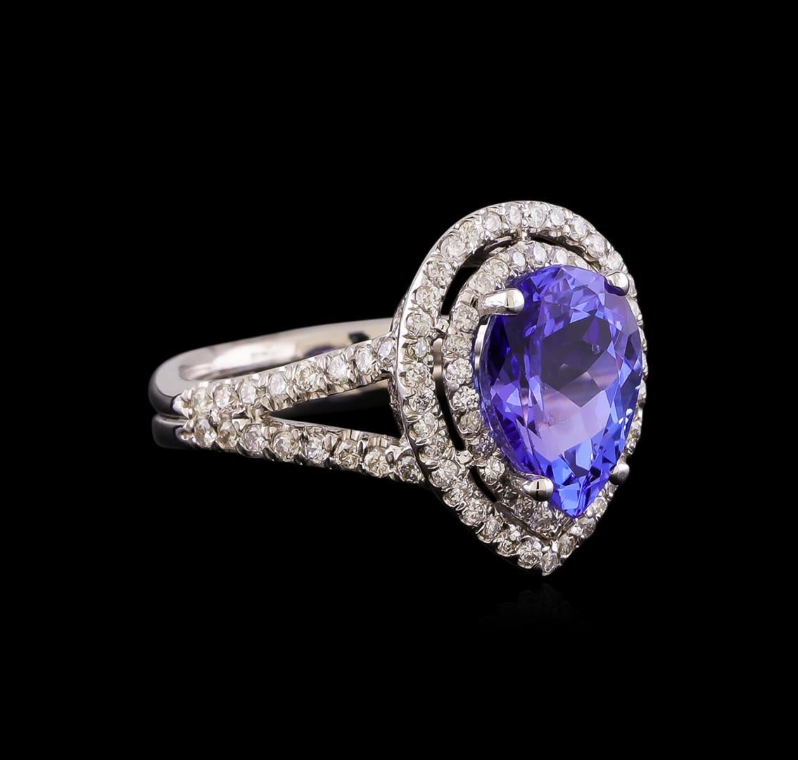 One electronically tested 14KT white gold lady's cast fashion ring with a split shank double halo with a bright polish finish. The featured lady's ring has a double shank measuring 4.01 millimeters wide. Condition is new, good workmanship. Containing: One prong set pear modified brilliant cut natural tanzanite, measuring 11.08 x 7.91 x 5.48mm, (depth est.) approximate weight of 3.15ct., clarity is eye clean, medium, moderately strong, bluish violet color, (GIA bV 5/4), cut is very good. Transmitting light with no distortion, transparent. Colored gemstones are presumed to have been subjected to commonly used enhancement processes. Graded in the setting. Sixty-Two prong set round brilliant cut diamonds, measuring 1.25 - 1.15 x 0.73mm (depth est.) approximate total weight of 62 Stones = 0.40ct. Graded in the setting. Clarity: SI-1 to SI-2. Color: H - I. Cut Good Thirty-Two prong set round brilliant cut diamonds, measuring 1.40 - 1.35 x 0.86mm (depth est.) approximate total weight of 32 Stones = 0.33ct. Graded in the setting. Clarity: SI-1 to SI-2. Color: H - I. Cut Good. Total Weight of Colored Stones 3.15ct. Total Weight of Diamonds 0.73ct. Total Weight of Ring 5.90gm. GAS Appraised at $8,215.00.