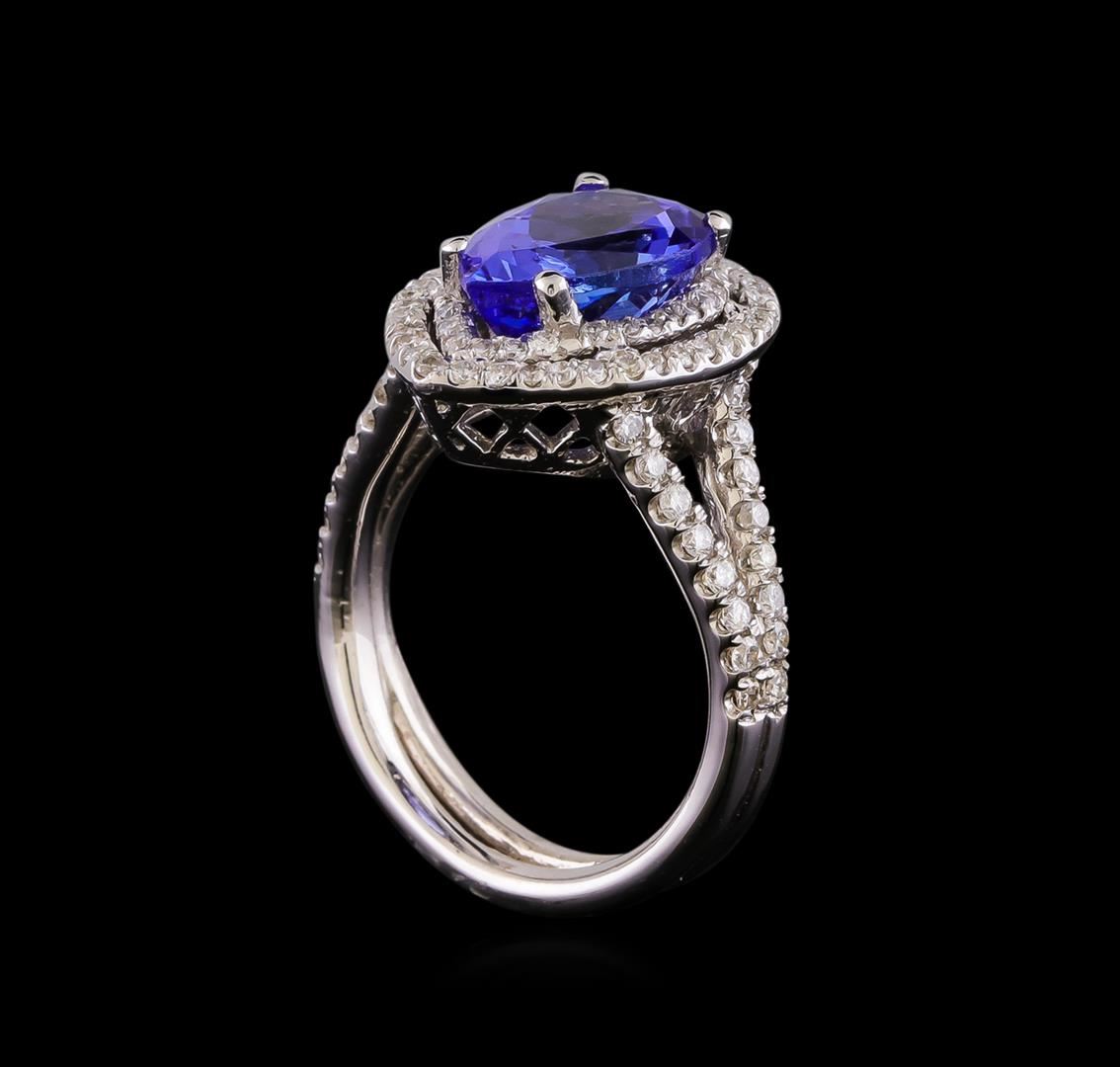One electronically tested 14KT white gold lady's cast fashion ring with a split shank double halo with a bright polish finish. The featured lady's ring has a double shank measuring 4.01 millimeters wide. Condition is new, good workmanship. Containing: One prong set pear modified brilliant cut natural tanzanite, measuring 11.08 x 7.91 x 5.48mm, (depth est.) approximate weight of 3.15ct., clarity is eye clean, medium, moderately strong, bluish violet color, (GIA bV 5/4), cut is very good. Transmitting light with no distortion, transparent. Colored gemstones are presumed to have been subjected to commonly used enhancement processes. Graded in the setting. Sixty-Two prong set round brilliant cut diamonds, measuring 1.25 - 1.15 x 0.73mm (depth est.) approximate total weight of 62 Stones = 0.40ct. Graded in the setting. Clarity: SI-1 to SI-2. Color: H - I. Cut Good Thirty-Two prong set round brilliant cut diamonds, measuring 1.40 - 1.35 x 0.86mm (depth est.) approximate total weight of 32 Stones = 0.33ct. Graded in the setting. Clarity: SI-1 to SI-2. Color: H - I. Cut Good. Total Weight of Colored Stones 3.15ct. Total Weight of Diamonds 0.73ct. Total Weight of Ring 5.90gm.