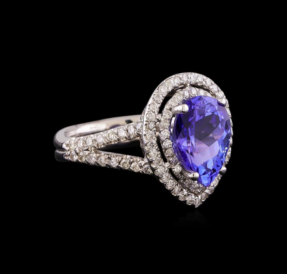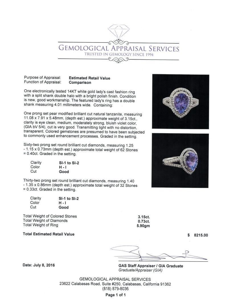 One electronically tested 14KT white gold lady's cast fashion ring with a split shank double halo with a bright polish finish. The featured lady's ring has a double shank measuring 4.01 millimeters wide. Condition is new, good workmanship. Containing: One prong set pear modified brilliant cut natural tanzanite, measuring 11.08 x 7.91 x 5.48mm, (depth est.) approximate weight of 3.15ct., clarity is eye clean, medium, moderately strong, bluish violet color, (GIA bV 5/4), cut is very good. Transmitting light with no distortion, transparent. Colored gemstones are presumed to have been subjected to commonly used enhancement processes. Graded in the setting. Sixty-Two prong set round brilliant cut diamonds, measuring 1.25 - 1.15 x 0.73mm (depth est.) approximate total weight of 62 Stones = 0.40ct. Graded in the setting. Clarity: SI-1 to SI-2. Color: H - I. Cut Good Thirty-Two prong set round brilliant cut diamonds, measuring 1.40 - 1.35 x 0.86mm (depth est.) approximate total weight of 32 Stones = 0.33ct. Graded in the setting. Clarity: SI-1 to SI-2. Color: H - I. Cut Good. Total Weight of Colored Stones 3.15ct. Total Weight of Diamonds 0.73ct. Total Weight of Ring 5.90gm.