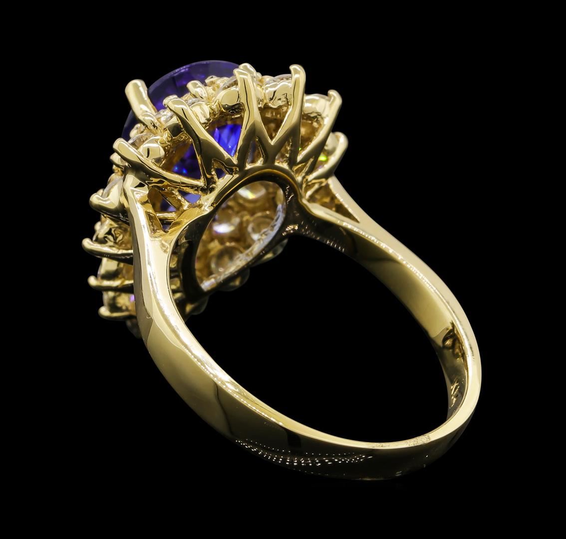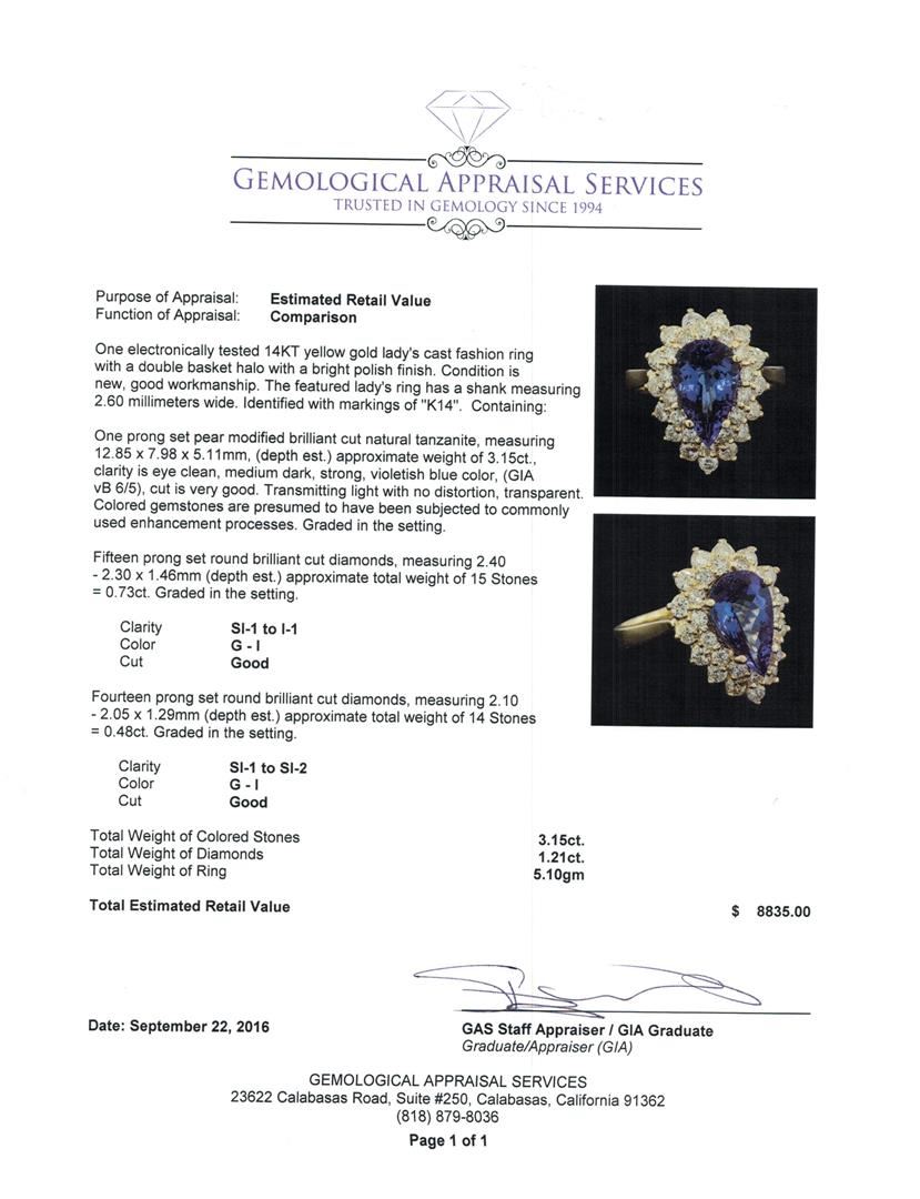 One electronically tested 14KT yellow gold lady's cast fashion ring with a double basket halo with a bright polish finish. The featured lady's ring has a shank measuring 2.60 millimeters wide. Identified with markings of 'K14'. Condition is new, good workmanship. Containing: One prong set pear modified brilliant cut natural tanzanite, measuring 12.85 x 7.98 x 5.11mm, (depth est.) approximate weight of 3.15ct., clarity is eye clean, medium dark, strong, violetish blue color, (GIA vB 6/5), cut is very good. Transmitting light with no distortion, transparent. Colored gemstones are presumed to have been subjected to commonly used enhancement processes. Graded in the setting. Fifteen prong set round brilliant cut diamonds, measuring 2.40 - 2.30 x 1.46mm (depth est.) approximate total weight of 15 Stones = 0.73ct. Graded in the setting. Clarity SI-1 to I-1. Color: G - I Cut Good Fourteen prong set round brilliant cut diamonds, measuring 2.10 - 2.05 x 1.29mm (depth est.) approximate total weight of 14 Stones = 0.48ct. Graded in the setting. Clarity SI-1 to SI-2. Color: G - I Cut Good. Total Weight of Colored Stones 3.15ct.. Total Weight of Diamonds 1.21ct.. Total Weight of Ring 5.10gm. GAS Appraised at $8,835.00.
