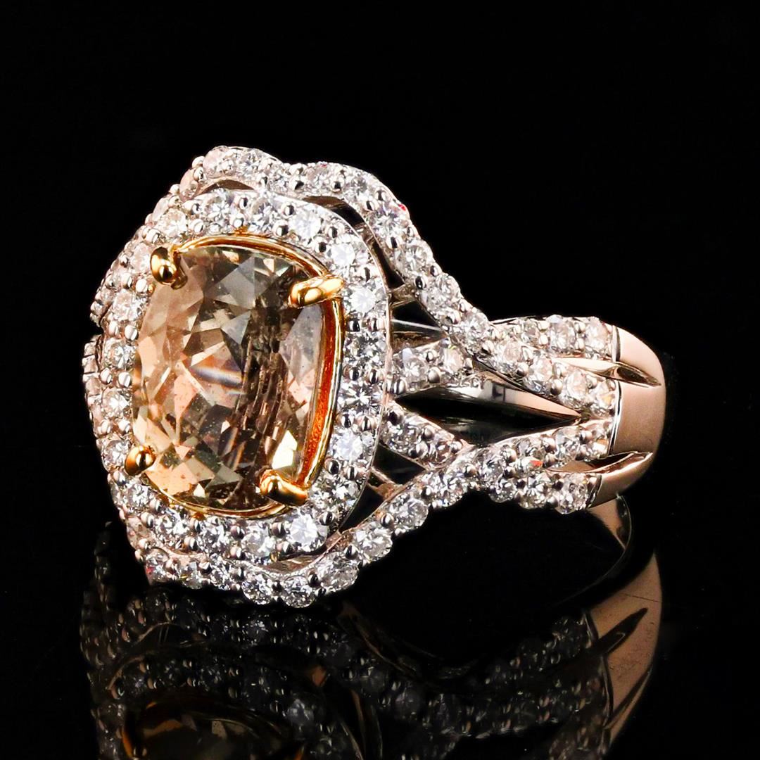 Eighteen karat (18K) two tone gold natural fancy sapphire corundum and diamond ring. A cushion brilliant cut natural yellowish orange to purplish pink sapphire corundum gemstone is mounted in the center of the ring. Round brilliant cut diamonds accent the