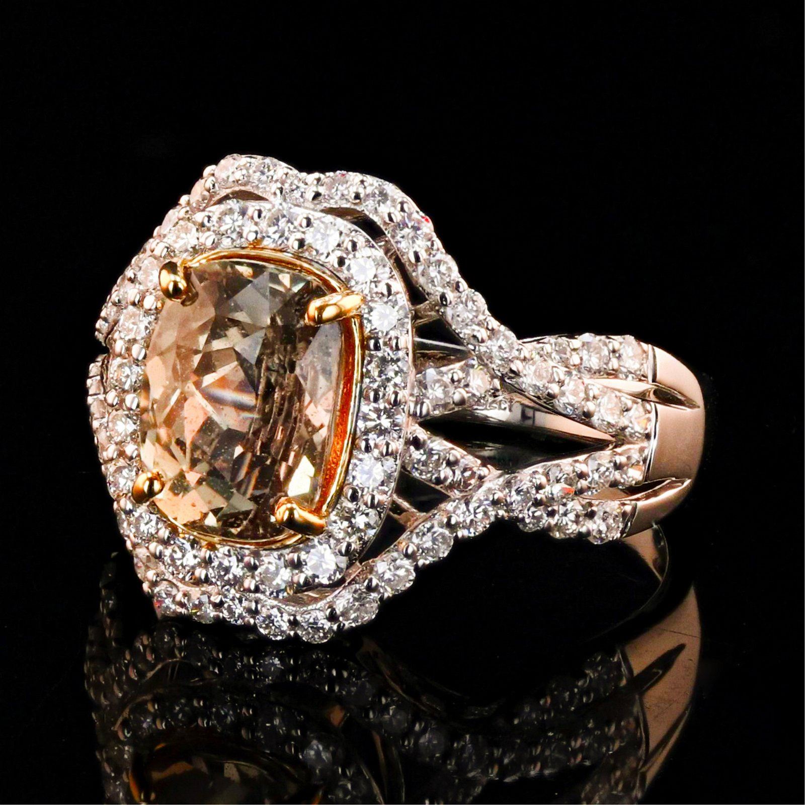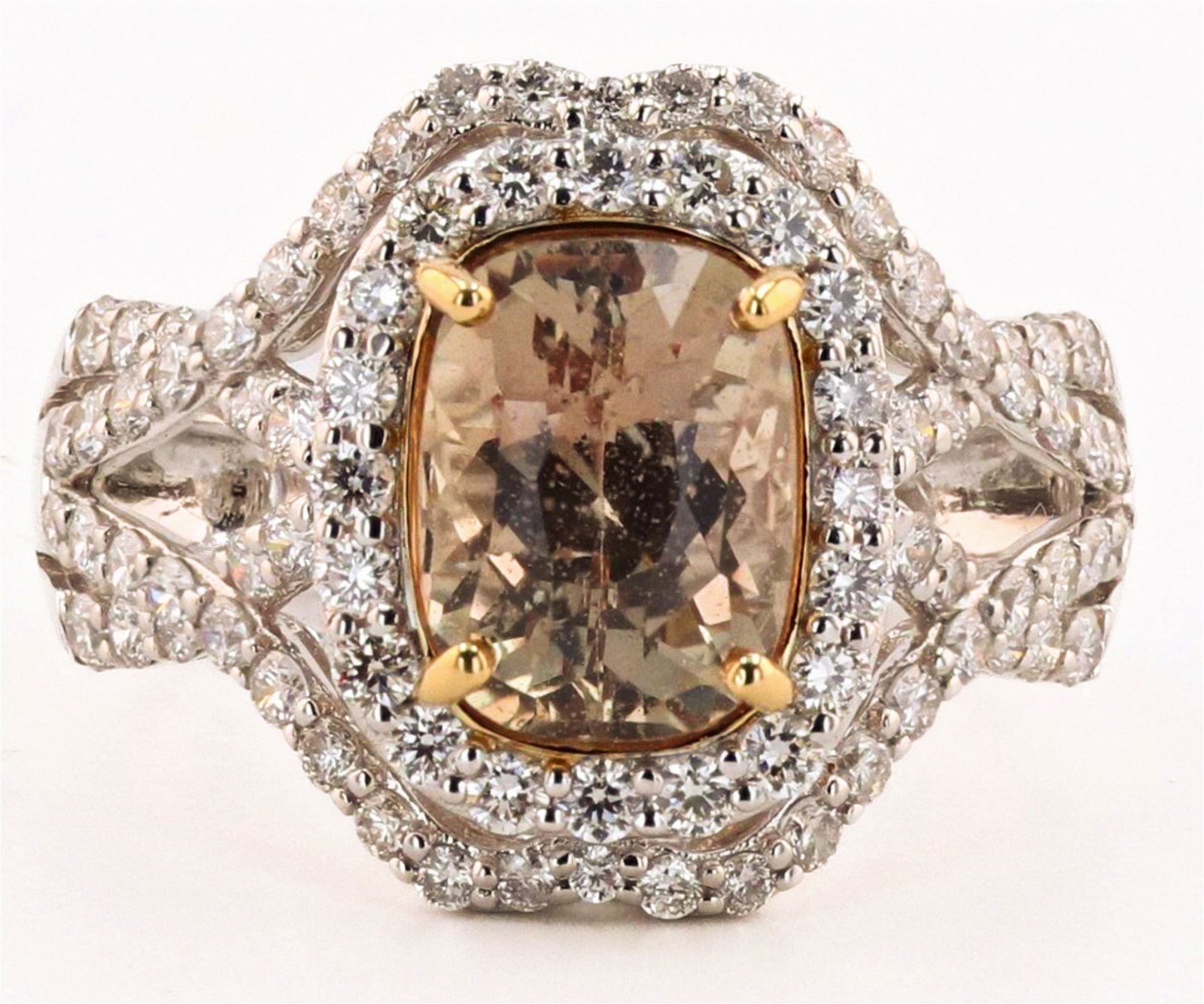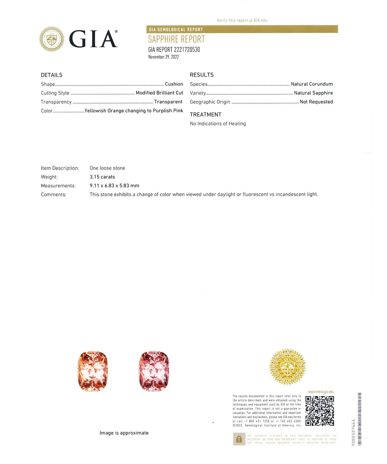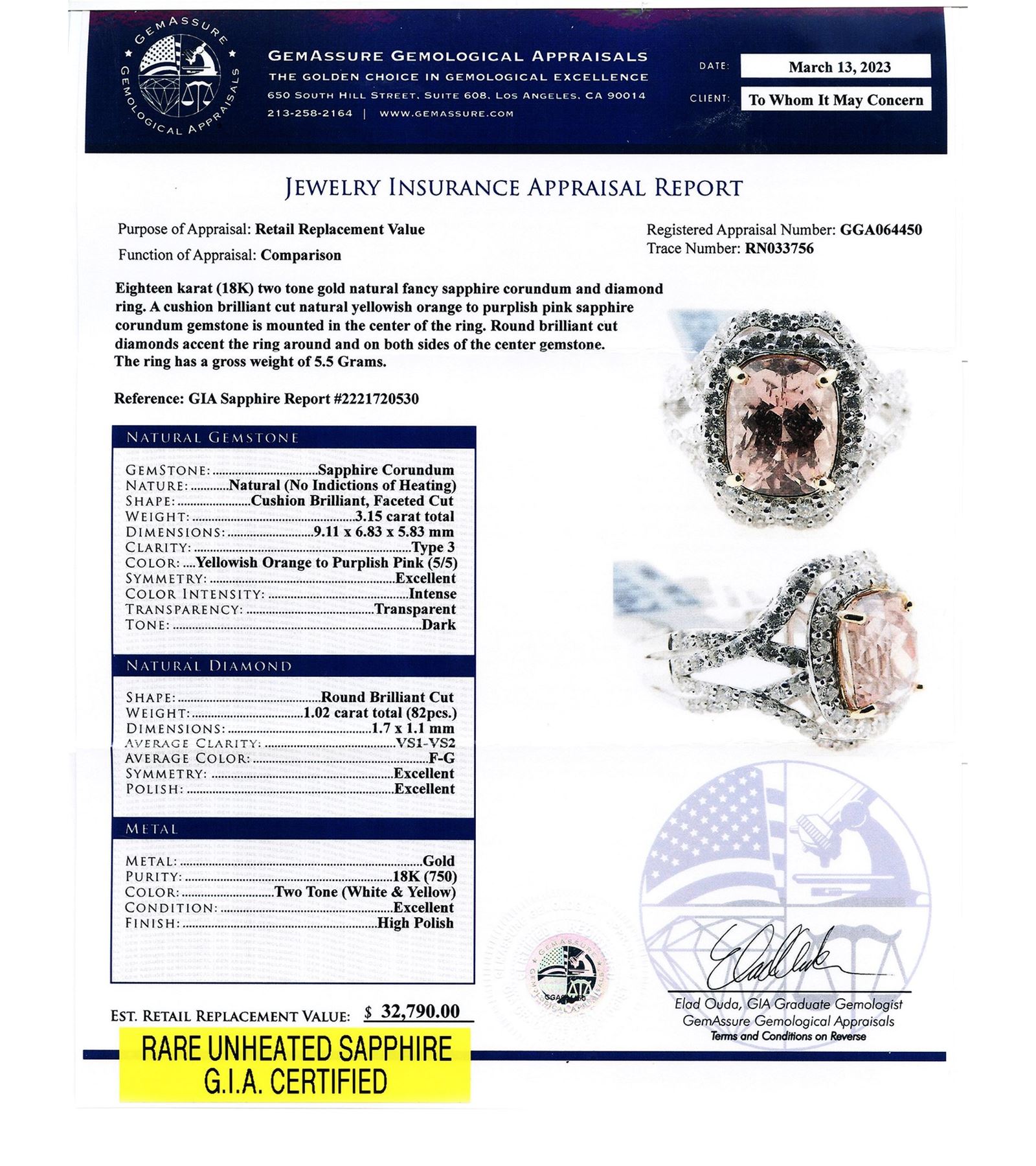 Eighteen karat (18K) two tone gold natural fancy sapphire corundum and diamond ring. A cushion brilliant cut natural yellowish orange to purplish pink sapphire corundum gemstone is mounted in the center of the ring. Round brilliant cut diamonds accent the ring around and on both sides of the center gemstone. The ring has a gross weight of 5.5 Grams. Reference: GIA Sapphire Report #2221720530 #NATURAL GEMSTONE#GEMSTONE: Sapphire Corundum NATURE: Natural (No Indictions of Heating) SHAPE: Cushion Brilliant, Faceted Cut WEIGHT: 3.15 carat total DIMENSIONS: 9.11 x 6.83 x 5.83mm CLARITY: Type 3 COLOR: Yellowish Orange toPurplish Pink (5/5) SYMMETRY: Excellent COLOR INTENSITY: Intense TRANSPARENCY: Transparent TONE: Dark #NATURAL DIAMOND# SHAPE: Round Brilliant Cut WEIGHT: 1.02 carat total (82pcs.) DIMENSIONS: 1.7 x 1.1mm AVERAGECLARITY: VS1-VS2 AVERAGE COLOR: F-G SYMMETRY: Excellent POLISH: Excellent #METAL# METAL: Gold PURITY: 18K (750) COLOR: Two Tone (White and Yellow) CONDITION: Excellent FINISH: High Polish