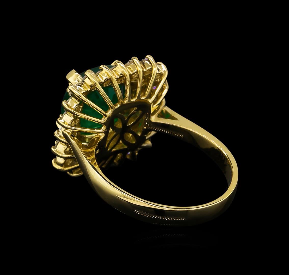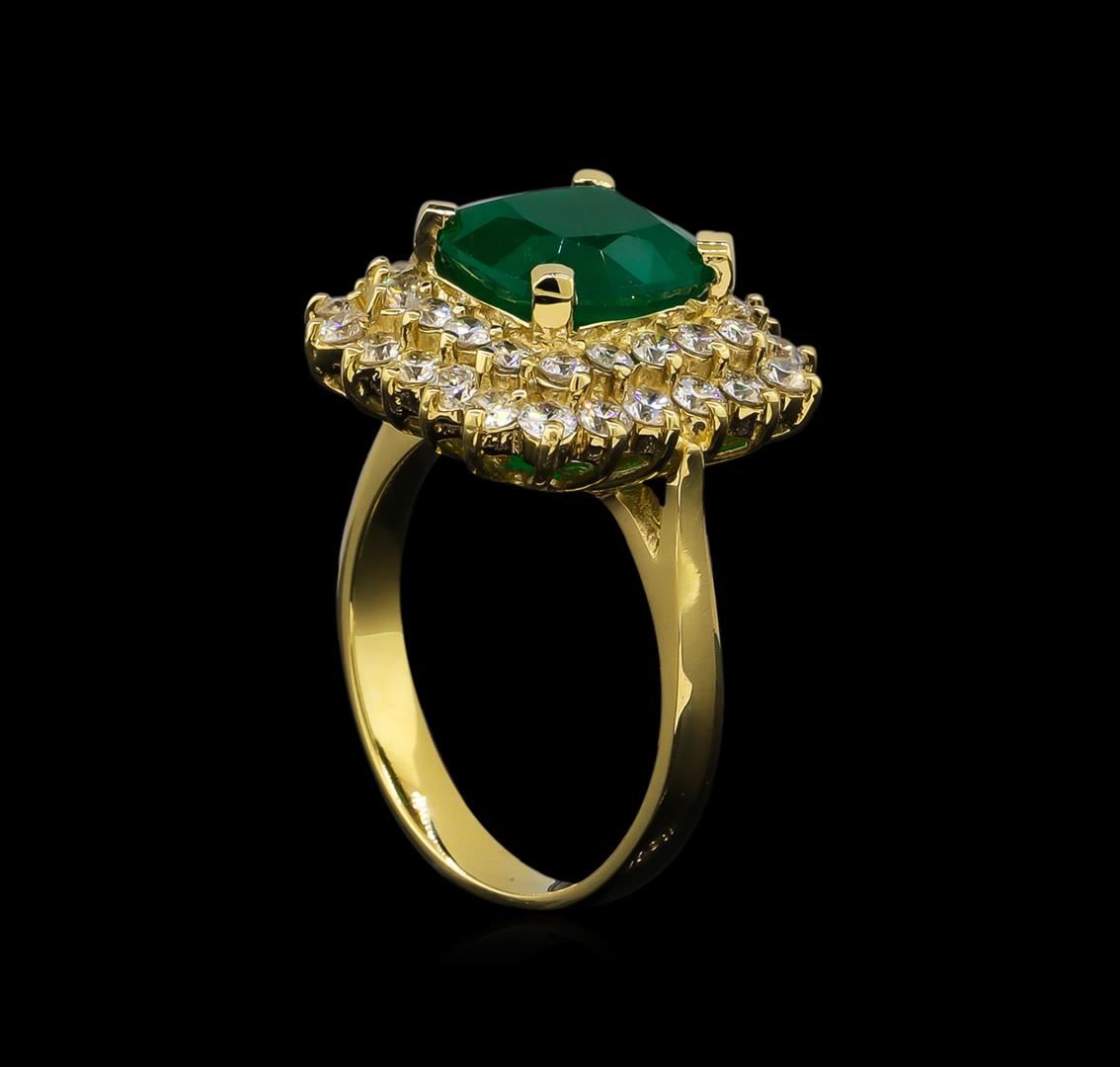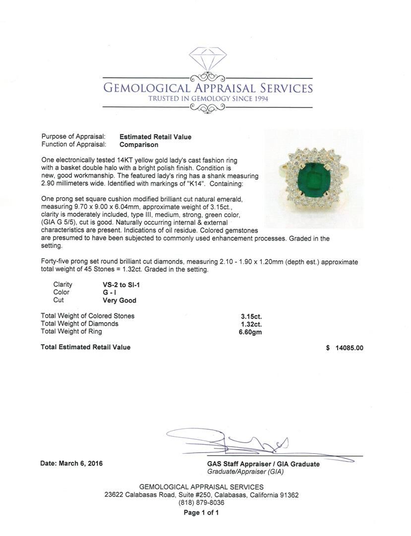 One electronically tested 14KT yellow gold lady's cast fashion ring with a basket double halo with a bright polish finish. The featured lady's ring has a shank measuring 2.90 millimeters wide. Identified with markings of "K14". Condition is new, good workmanship. Containing: One prong set square cushion modified brilliant cut natural emerald, measuring 9.70 x 9.00 x 6.04mm, approximate weight of 3.15ct., clarity is moderately included, type III, medium, strong, green color, (GIA G 5/5), cut is good. Naturally occurring internal & external characteristics are present. Indications of oil residue. Colored gemstones are presumed to have been subjected to commonly used enhancement processes. Graded in the setting. Forty-Five prong set round brilliant cut diamonds, measuring 2.10 - 1.90 x 1.20mm (depth est.) approximate. Total Weight of 45 Stones = 1.32ct. Graded in the setting. Clarity: VS-2 to SI-1. Color: G - I. Cut Very Good. Total Weight of Colored Stones 3.15ct. Total Weight of Diamonds 1.32ct. Total Weight of Ring 6.60gm. GAS Appraised at $14,085.00.