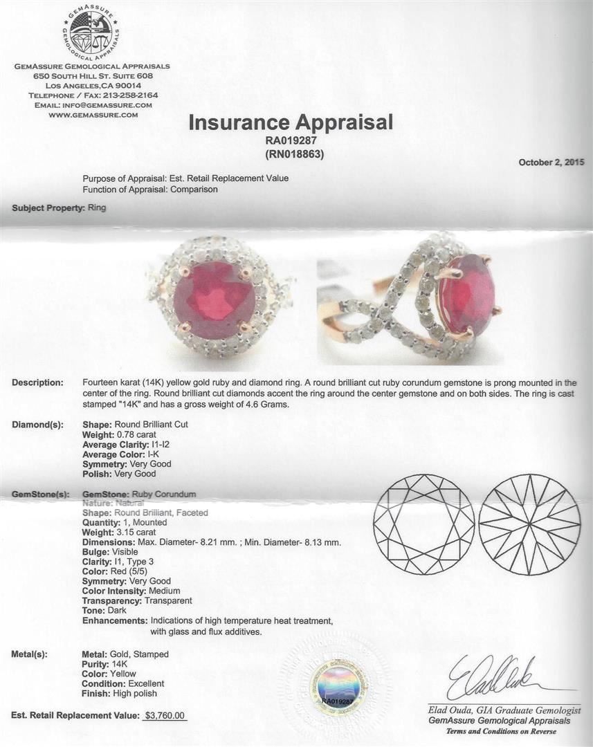 Fourteen karat (14K) yellow gold ruby and diamond ring. A round brilliant cut ruby corundum gemstone is prong mounted in the center of the ring. Round brilliant cut diamonds accent the ring around the center gemstone and on both sides. The ring is cast stamped "14K" and has a gross weight of 4.6 Grams. Diamond(s): Shape: Round Brilliant Cut. Weight: 0.78 carat. Average Clarity: I1-I2. Average Color: I-K. Symmetry: Very Good. Polish: Very Good. Gemstone(s): GemStone: Ruby Corundum. Nature: Natural. Shape: Round Brilliant, Faceted. Quantity: 1, Mounted. Weight 3.15 carat. Dimensions: Length-8.21 mm. ; Min. Diameter 8.13 mm. Bulge: Visible. Clarity: I1, Type 3. Color: Red (5/5). Symmetry: Very Good. Color Intensity: Medium. Transparency: Transparent. Tone: Dark. Enhancements: Indications of high temperature heat treatment, with glass and flux additives. Metal(s): Metal: Gold, Stamped. Purity: 14K. Color: Yellow. Condition: Excellent. Finish: High polish. GGA Appraised.