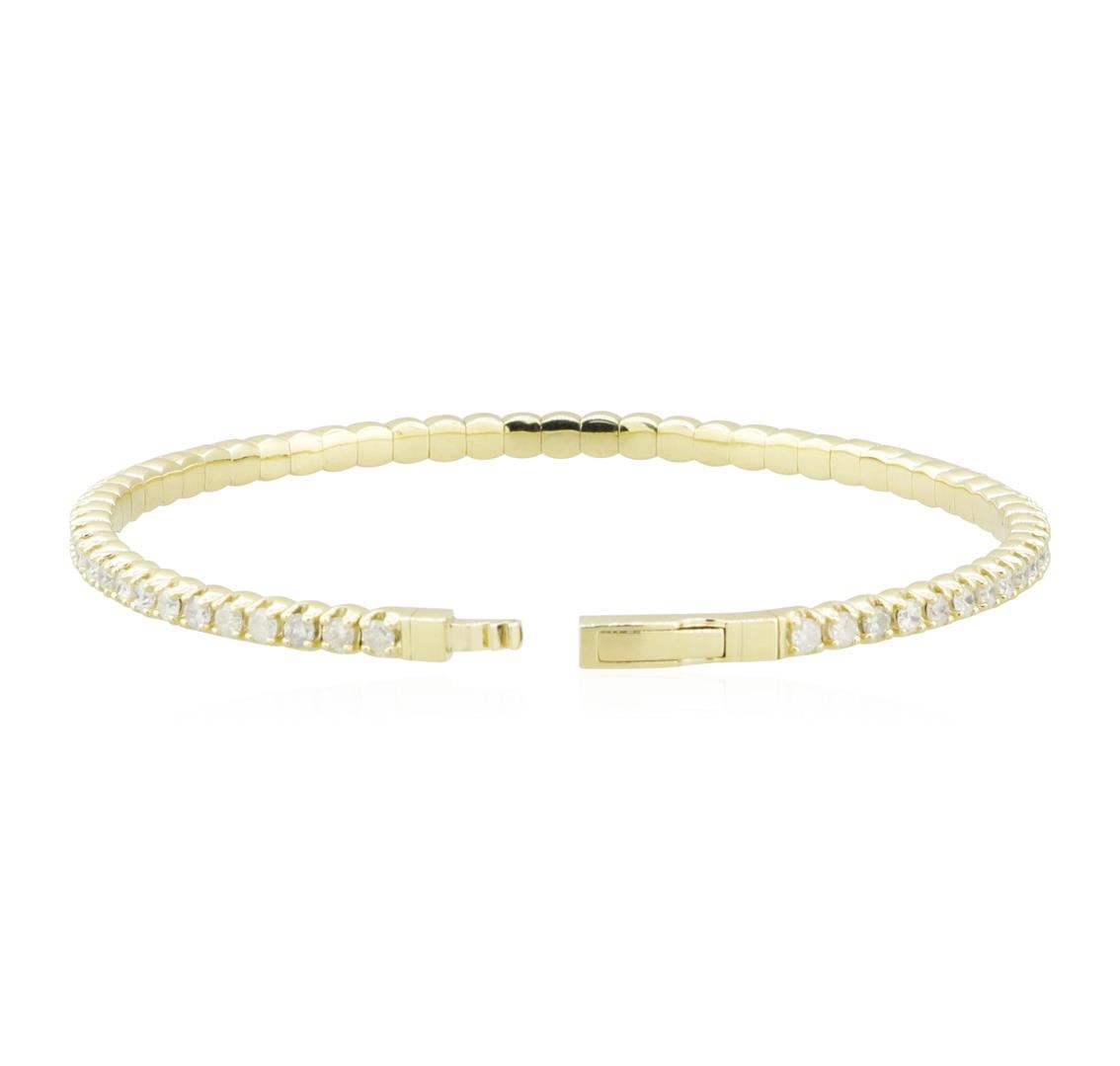 One Polished, and tested, 14KT yellow gold bangle bracelet with a bright finish. The bangle is mounted with 61 genuine round diamonds weighing approzimately 3.06ctw. This item weighs 12.4 grams, condition is new, excellent workmanship. Main Gemstones. Identity: Natural Diamond. Shape: Round. Cutting Style: Brilliant Cut. Quantity: 61 Diamonds. Measurements: 2.5-2.7mm. Total Weight: 3.16 carats. Color Grade: I-K. Clarity Grade 11-13. Cut grade: 2.418. Specific Gravity: 3.52 +/-0.01 Hardness: 10. Total diamond weight: 3.16cts. Total Weight 12.4g Gold Content 14KT Yellow Gold. Estimated Retail Replacement Value: $6,987.00