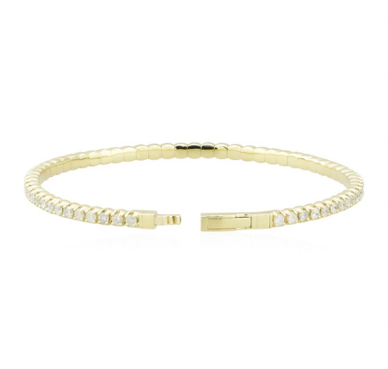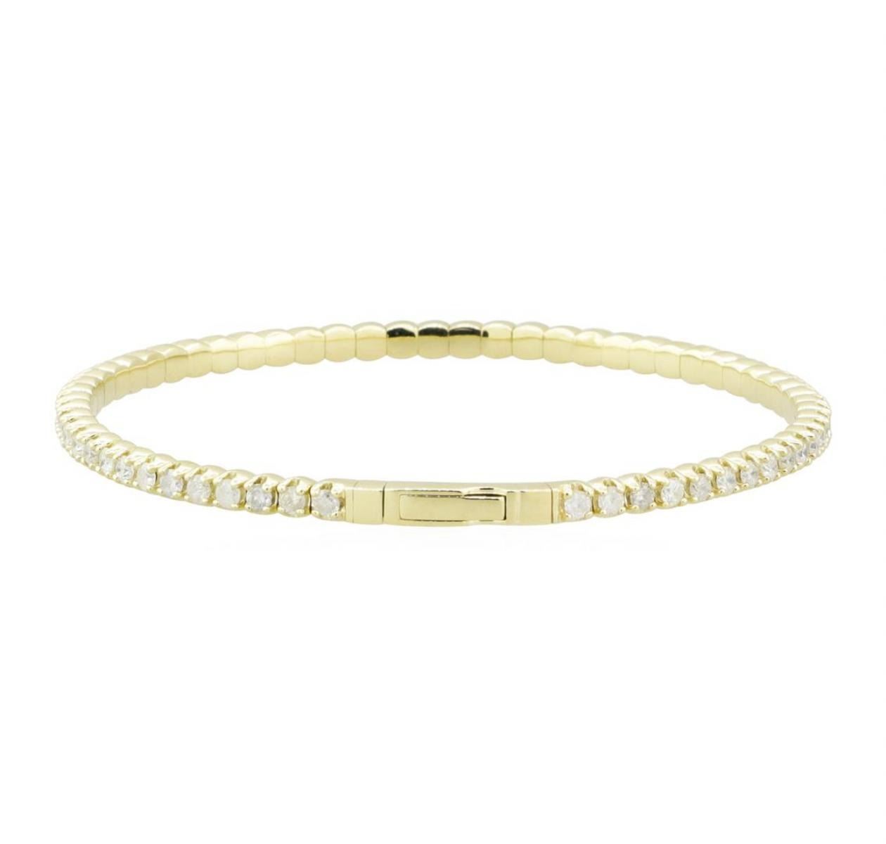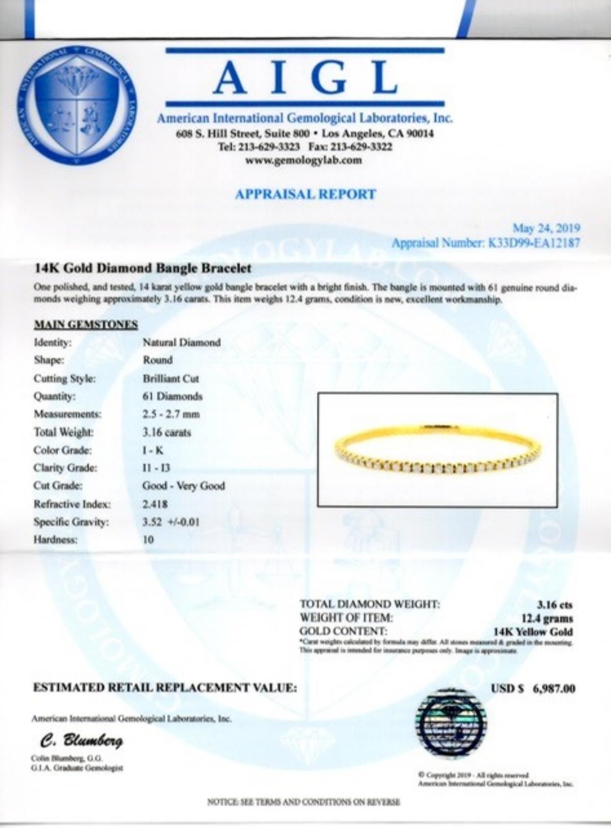 One Polished, and tested, 14KT yellow gold bangle bracelet with a bright finish. The bangle is mounted with 61 genuine round diamonds weighing approzimately 3.06ctw. This item weighs 12.4 grams, condition is new, excellent workmanship. Main Gemstones. Identity: Natural Diamond. Shape: Round. Cutting Style: Brilliant Cut. Quantity: 61 Diamonds. Measurements: 2.5-2.7mm. Total Weight: 3.16 carats. Color Grade: I-K. Clarity Grade 11-13. Cut grade: 2.418. Specific Gravity: 3.52 +/-0.01 Hardness: 10. Total diamond weight: 3.16cts. Total Weight 12.4g Gold Content 14KT Yellow Gold. Estimated Retail Replacement Value: $6,987.00
