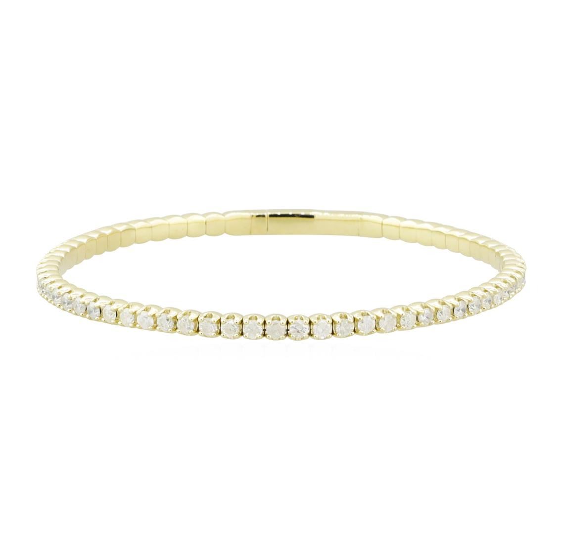 One Polished, and tested, 14KT yellow gold bangle bracelet with a bright finish. The bangle is mounted with 61 genuine round diamonds weighing approzimately 3.06ctw. This item weighs 12.4 grams, condition is new, excellent workmanship. Main Gemstones. Identity: Natural Diamond. Shape: Round. Cutting Style: Brilliant Cut. Quantity: 61 Diamonds. Measurements: 2.5-2.7mm. Total Weight: 3.16 carats. Color Grade: I-K. Clarity Grade 11-13. Cut grade: 2.418. Specific Gravity: 3.52 +/-0.01 Hardness: 10. Total diamond weight: 3.16cts. Total Weight 12.4g Gold Content 14KT Yellow Gold. Estimated Retail Replacement Value: $6,987.00