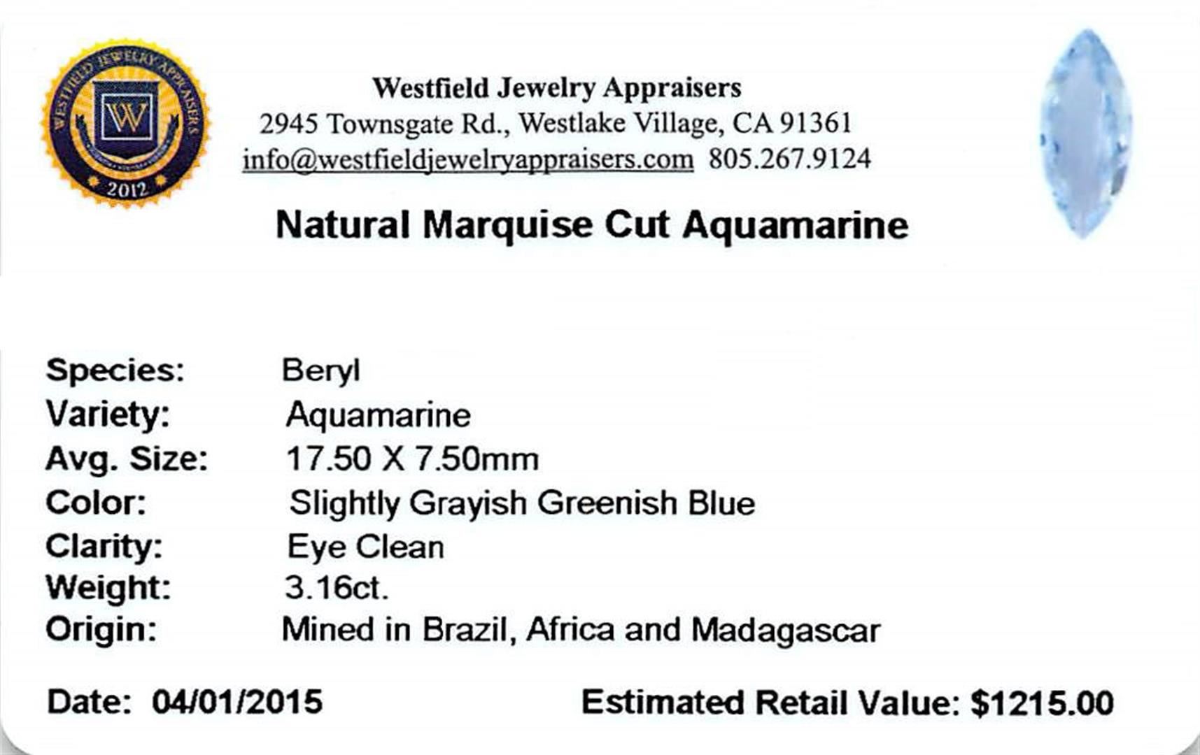One marquise cut natural aquamarine exact weight 3.16ct., type I, medium, slightly grayish, very slightly greenish blue color, (GIA vslgB 5/2), cut is good. Westfield Appraised at $1,215.00.