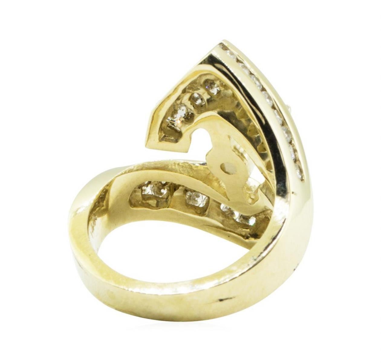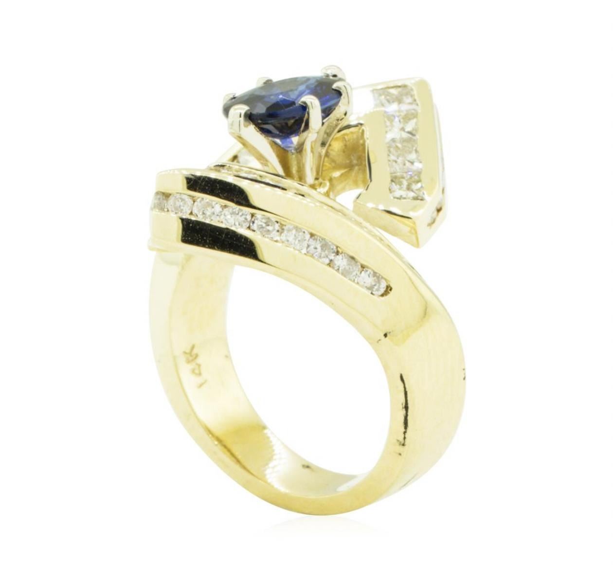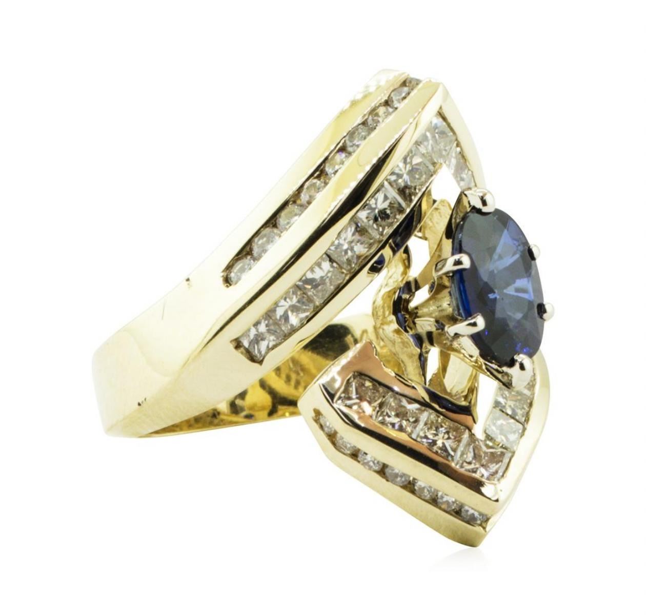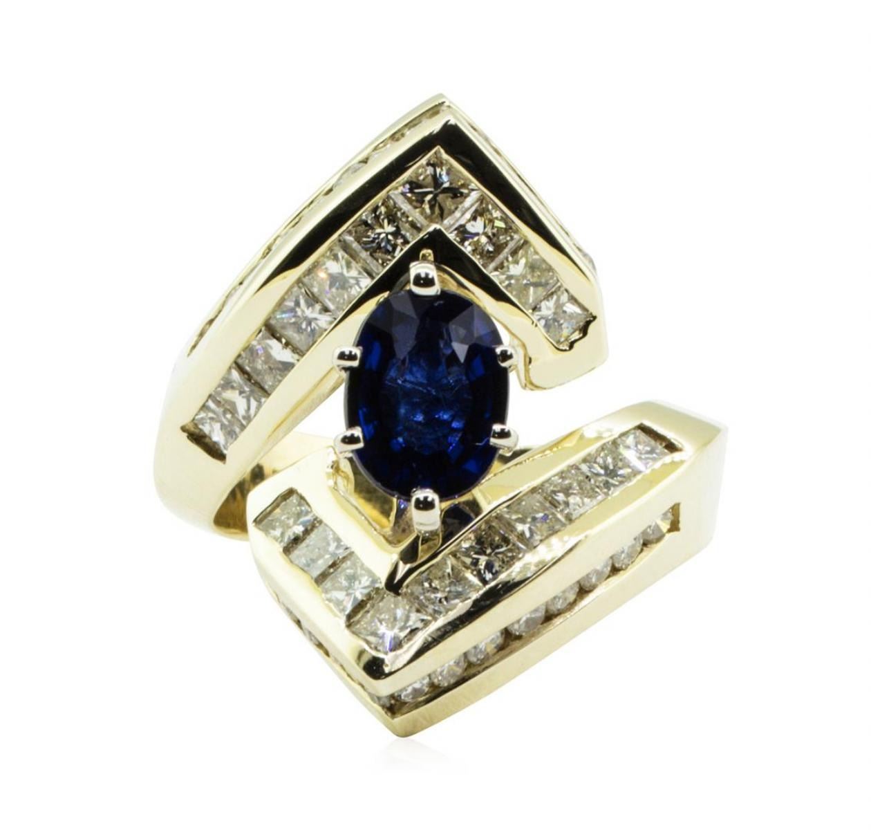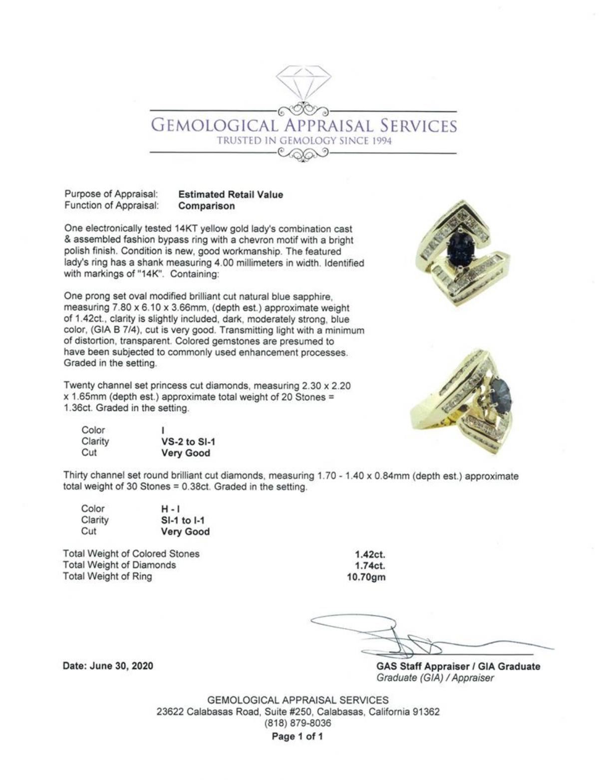One electronically tested 14KT yellow gold lady's combination cast & assembled fashion bypass ring with a chevron motif with a bright polish finish. The featured lady's ring has a shank measuring 4.00 millimeters in width. Identified with markings of '14K'. Condition is new, good workmanship. Containing: One prong set oval modified brilliant cut natural blue sapphire, measuring 7.80 x 6.10 x 3.66mm, (depth est.) approximate weight of 1.42ct., clarity is slightly included, dark, moderately strong, blue color, (GIA B 7/4), cut is very good. Transmitting light with a minimum of distortion, transparent. Colored gemstones are presumed to have been subjected to commonly used enhancement processes. Graded in the setting. Twenty channel set princess cut diamonds, measuring 2.30 x 2.20 x 1.65mm (depth est.) approximate total weight of 20 Stones = 1.36ct. Graded in the setting. Color I Clarity VS-2 to SI-1 Cut Very Good Thirty channel set round brilliant cut diamonds, measuring 1.70 - 1.40 x 0.84mm (depth est.) approximate total weight of 30 Stones = 0.38ct. Graded in the setting. Color H - I Clarity SI-1 to I-1 Cut Very Good. Total Weight of Colored Stones 1.42ct.. Total Weight of Diamonds 1.74ct.. Total Weight of Ring 10.70gm GAS Appraised at $5475.00. GAS Appraised.