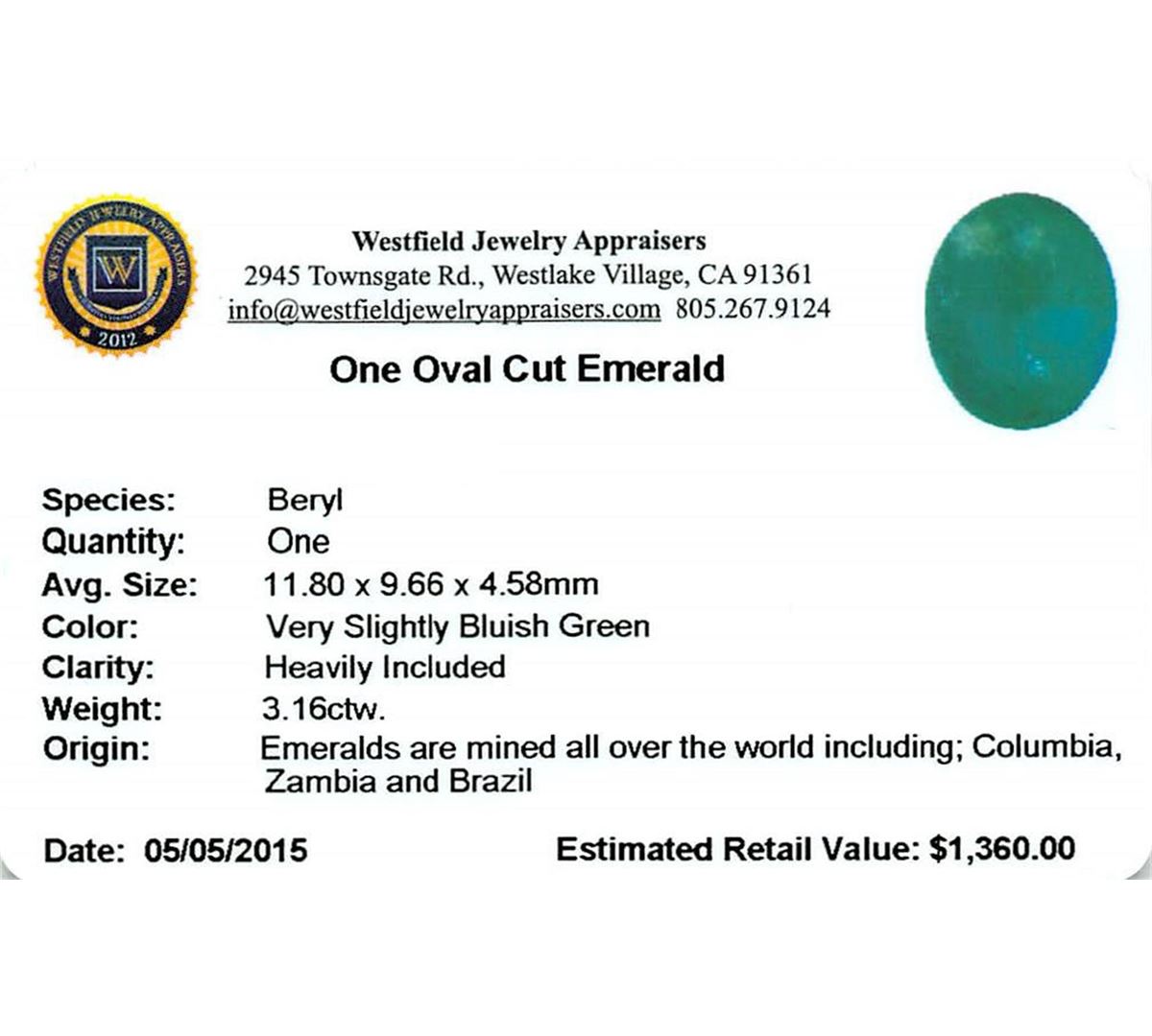 One oval mixed cut natural emerald, measuring 11.80 x 9.66 x 4.58mm, approximate weight of 3.16ct., clarity is heavily included, type III, medium, very slightly grayish, very slightly bluish green color, (GIA vslbG 5/3), cut is good. Indications of multiple laboratory enhancements, including high temperature heat treatment. Westfield Appraised at $1,360.00.