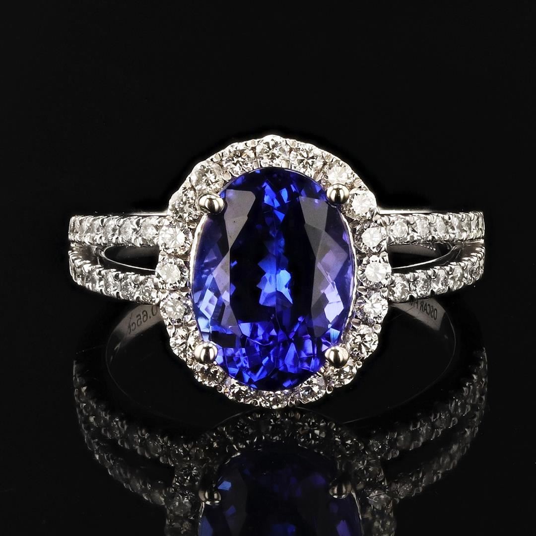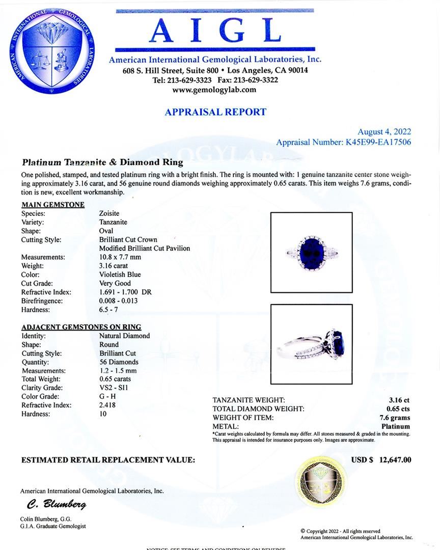 3.16ctw Tanzanite and 0.65ctw Diamond Platinum Ring. One polished, stamped, and tested platinum ring with a bright finish. The ring is mounted with: 1 genuine tanzanite center stone weighing approximately 3.16 carat, and 56 genuine round diamonds weighing approximately 0.65 carats. This item weighs 7.6 grams, condition is new, excellent workmanship. MAIN GEMSTONE Species: Zoisite Variety: Tanzanite Shape: Oval Cutting Style: Brilliant Cut Crown Modified Brilliant Cut Pavilion Measurements: 10.8 x 7.7mm Weight: 3.16 carat Color: Violetish Blue Cut Grade: Very Good Refractive Index: 1.691 - 1.700 DR Birefringence: 0.008 - 0.013 Hardness: 6.5 - 7 ADJACENT GEMSTONES ON RING Identity: Natural Diamond Shape: Round Cutting Style: Brilliant Cut Quantity: 56 Diamonds Measurements: 1.2 - 1.5mm Total Weight: 0.65 carats Clarity Grade: VS2 to SI1 Color Grade: G - H Refractive Index: 2.418 Hardness: 10 TANZANITE WEIGHT: 3.16ct TOTAL DIAMOND WEIGHT: 0.65ctw WEIGHT OF ITEM: 7.6 grams METAL: Platinum