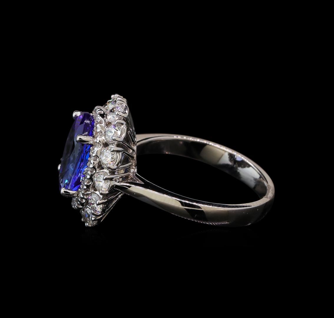 One electronically tested 14KT white gold lady's cast fashion ring with a double basket halo with a bright polish finish. The featured lady's ring has a shank measuring 2.77 millimeters wide. Identified with markings of 'K14'. Condition is new, good workmanship. Containing: One prong set oval modified brilliant cut natural tanzanite, measuring 11.14 x 8.00 x 4.75mm, (depth est.) 5%. bulge factor, approximate weight of 3.16ct., clarity is eye clean, medium light, moderately strong, violetish blue color, (GIA vB 4/4), cut is very good. Transmitting light with no distortion, transparent. Colored gemstones are presumed to have been subjected to commonly used enhancement processes. Graded in the setting. Fourteen prong set round brilliant cut diamonds, measuring 2.60 - 2.50 x 1.58mm (depth est.) approximate total weight of 14 Stones = 0.90ct. Graded in the setting. Clarity SI-1 to SI-2. Color: H - I Cut Good Twenty-Four prong set round brilliant cut diamonds, measuring 1.20 - 1.15 x 0.73mm (depth est.) approximate total weight of 24 Stones = 0.15ct. Graded in the setting. Clarity SI-1 to I-1. Color: H - I Cut Good. Total Weight of Colored Stones 3.16ct. Total Weight of Diamonds 1.05ct. Total Weight of Ring 5.20gm. GAS Appraised at $7,565.00.