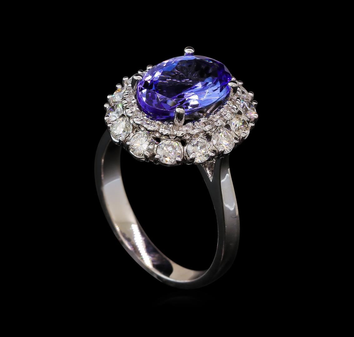 One electronically tested 14KT white gold lady's cast fashion ring with a double basket halo with a bright polish finish. The featured lady's ring has a shank measuring 2.77 millimeters wide. Identified with markings of 'K14'. Condition is new, good workmanship. Containing: One prong set oval modified brilliant cut natural tanzanite, measuring 11.14 x 8.00 x 4.75mm, (depth est.) 5%. bulge factor, approximate weight of 3.16ct., clarity is eye clean, medium light, moderately strong, violetish blue color, (GIA vB 4/4), cut is very good. Transmitting light with no distortion, transparent. Colored gemstones are presumed to have been subjected to commonly used enhancement processes. Graded in the setting. Fourteen prong set round brilliant cut diamonds, measuring 2.60 - 2.50 x 1.58mm (depth est.) approximate total weight of 14 Stones = 0.90ct. Graded in the setting. Clarity SI-1 to SI-2. Color: H - I Cut Good Twenty-Four prong set round brilliant cut diamonds, measuring 1.20 - 1.15 x 0.73mm (depth est.) approximate total weight of 24 Stones = 0.15ct. Graded in the setting. Clarity SI-1 to I-1. Color: H - I Cut Good. Total Weight of Colored Stones 3.16ct. Total Weight of Diamonds 1.05ct. Total Weight of Ring 5.20gm. GAS Appraised at $7,565.00.