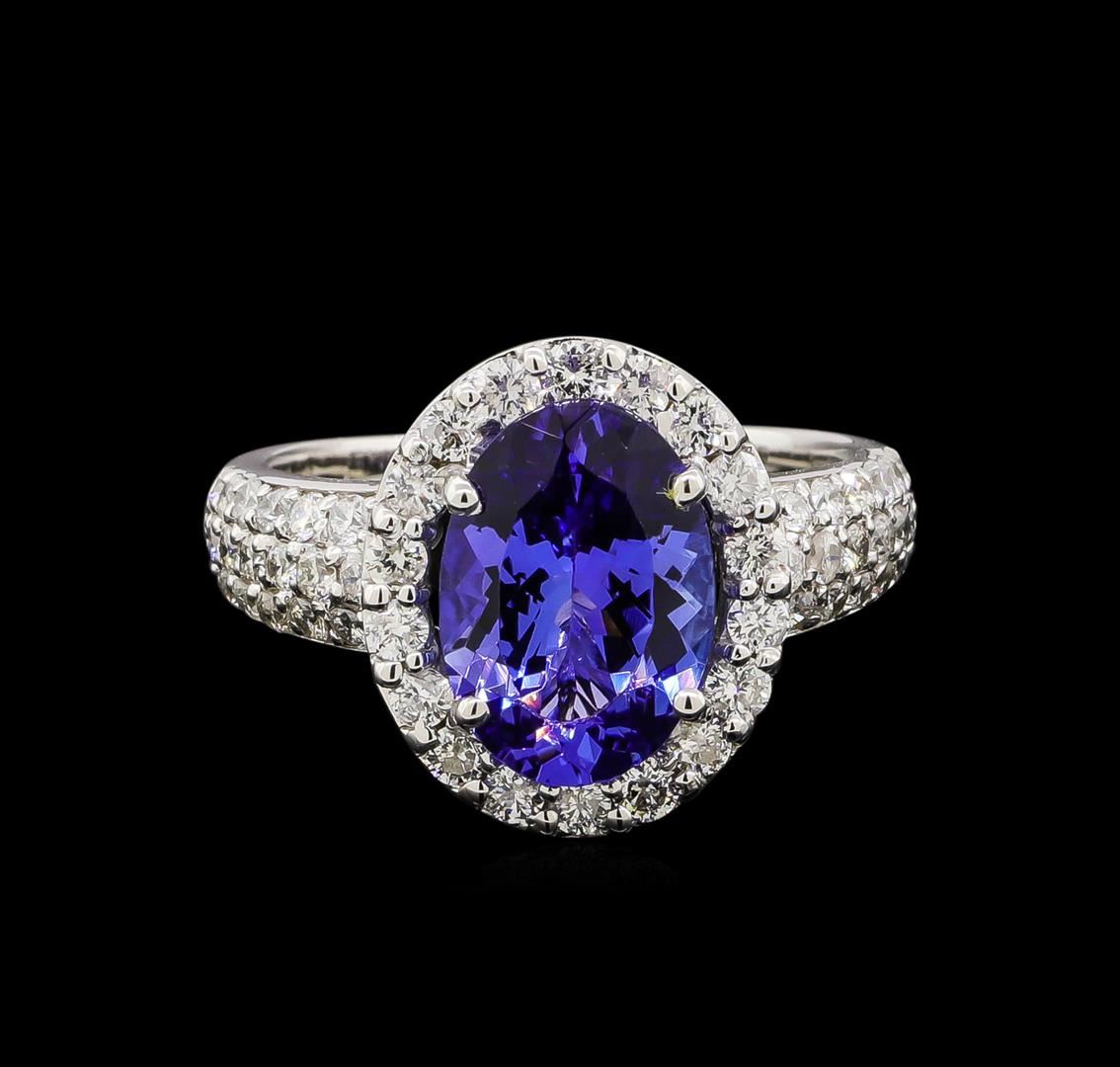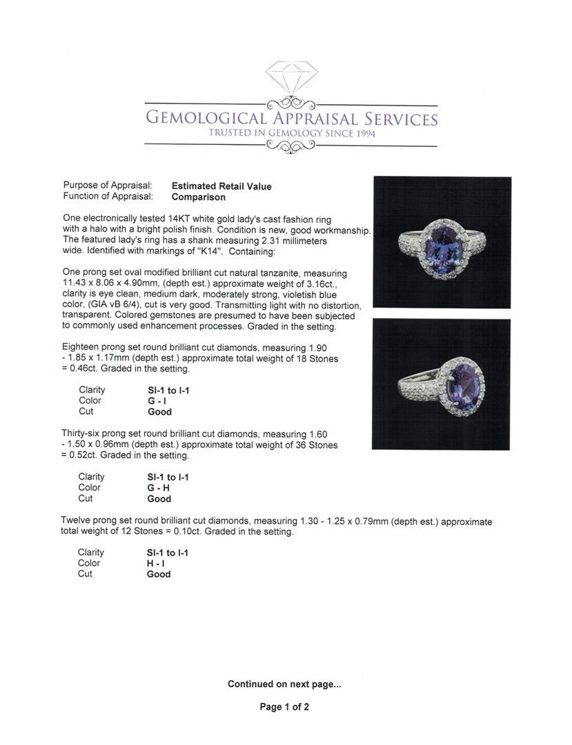 One electronically tested 14KT white gold lady's cast fashion ring with a halo with a bright polish finish. The featured lady's ring has a shank measuring 2.31 millimeters wide. Identified with markings of 'K14'. Condition is new, good workmanship. Containing: One prong set oval modified brilliant cut natural tanzanite, measuring 11.43 x 8.06 x 4.90mm, (depth est.) approximate weight of 3.16ct., clarity is eye clean, medium dark, moderately strong, violetish blue color, (GIA vB 6/4), cut is very good. Transmitting light with no distortion, transparent. Colored gemstones are presumed to have been subjected to commonly used enhancement processes. Graded in the setting. Eighteen prong set round brilliant cut diamonds, measuring 1.90 - 1.85 x 1.17mm (depth est.) approximate total weight of 18 Stones = 0.46ct. Graded in the setting. Clarity SI-1 to I-1. Color: G - I Cut Good Thirty-Six prong set round brilliant cut diamonds, measuring 1.60 - 1.50 x 0.96mm (depth est.) approximate total weight of 36 Stones = 0.52ct. Graded in the setting. Clarity SI-1 to I-1. Color: G - H Cut Good Twelve prong set round brilliant cut diamonds, measuring 1.30 - 1.25 x 0.79mm (depth est.) approximate total weight of 12 Stones = 0.10ct. Graded in the setting. Clarity SI-1 to I-1. Color: H - I Cut Good. Total Weight of Colored Stones 3.16ct.. Total Weight of Diamonds 1.08ct.. Total Weight of Ring 5.90gm. GAS Appraised at $9,140.00.