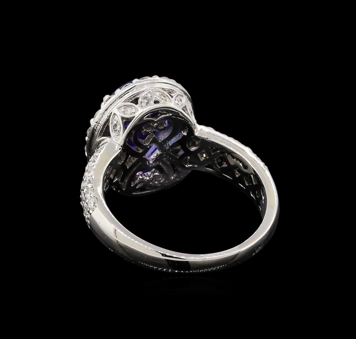 One electronically tested 14KT white gold lady's cast fashion ring with a halo with a bright polish finish. The featured lady's ring has a shank measuring 2.31 millimeters wide. Identified with markings of 'K14'. Condition is new, good workmanship. Containing: One prong set oval modified brilliant cut natural tanzanite, measuring 11.43 x 8.06 x 4.90mm, (depth est.) approximate weight of 3.16ct., clarity is eye clean, medium dark, moderately strong, violetish blue color, (GIA vB 6/4), cut is very good. Transmitting light with no distortion, transparent. Colored gemstones are presumed to have been subjected to commonly used enhancement processes. Graded in the setting. Eighteen prong set round brilliant cut diamonds, measuring 1.90 - 1.85 x 1.17mm (depth est.) approximate total weight of 18 Stones = 0.46ct. Graded in the setting. Clarity SI-1 to I-1. Color: G - I Cut Good Thirty-Six prong set round brilliant cut diamonds, measuring 1.60 - 1.50 x 0.96mm (depth est.) approximate total weight of 36 Stones = 0.52ct. Graded in the setting. Clarity SI-1 to I-1. Color: G - H Cut Good Twelve prong set round brilliant cut diamonds, measuring 1.30 - 1.25 x 0.79mm (depth est.) approximate total weight of 12 Stones = 0.10ct. Graded in the setting. Clarity SI-1 to I-1. Color: H - I Cut Good. Total Weight of Colored Stones 3.16ct.. Total Weight of Diamonds 1.08ct.. Total Weight of Ring 5.90gm. GAS Appraised at $9,140.00.