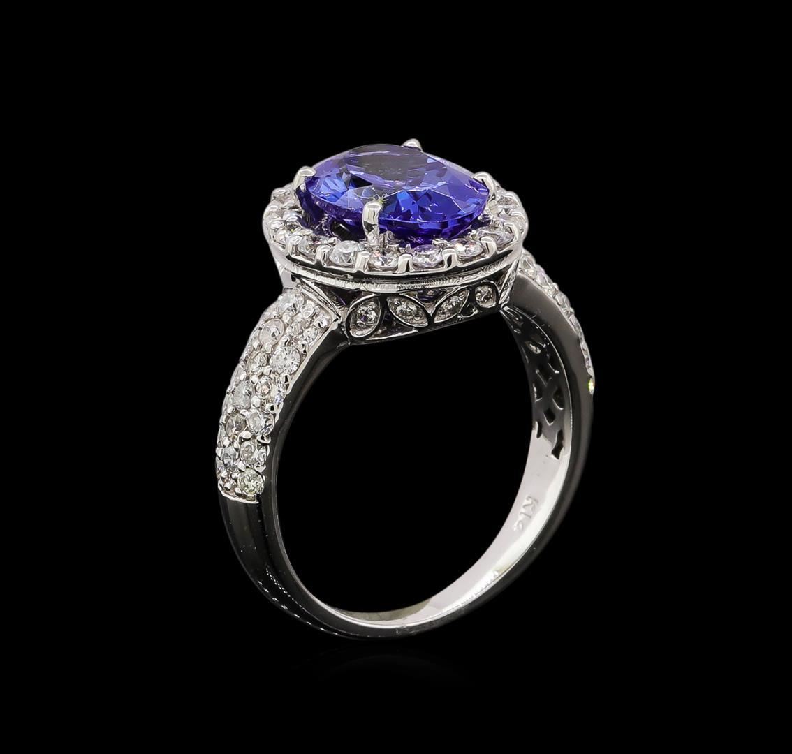 One electronically tested 14KT white gold lady's cast fashion ring with a halo with a bright polish finish. The featured lady's ring has a shank measuring 2.31 millimeters wide. Identified with markings of 'K14'. Condition is new, good workmanship. Containing: One prong set oval modified brilliant cut natural tanzanite, measuring 11.43 x 8.06 x 4.90mm, (depth est.) approximate weight of 3.16ct., clarity is eye clean, medium dark, moderately strong, violetish blue color, (GIA vB 6/4), cut is very good. Transmitting light with no distortion, transparent. Colored gemstones are presumed to have been subjected to commonly used enhancement processes. Graded in the setting. Eighteen prong set round brilliant cut diamonds, measuring 1.90 - 1.85 x 1.17mm (depth est.) approximate total weight of 18 Stones = 0.46ct. Graded in the setting. Clarity SI-1 to I-1. Color: G - I Cut Good Thirty-Six prong set round brilliant cut diamonds, measuring 1.60 - 1.50 x 0.96mm (depth est.) approximate total weight of 36 Stones = 0.52ct. Graded in the setting. Clarity SI-1 to I-1. Color: G - H Cut Good Twelve prong set round brilliant cut diamonds, measuring 1.30 - 1.25 x 0.79mm (depth est.) approximate total weight of 12 Stones = 0.10 ct. Graded in the setting. Clarity SI-1 to I-1. Color: H - I Cut Good. Total Weight of Colored Stones 3.16ct.. Total Weight of Diamonds 1.08ct.. Total Weight of Ring 5.90gm.