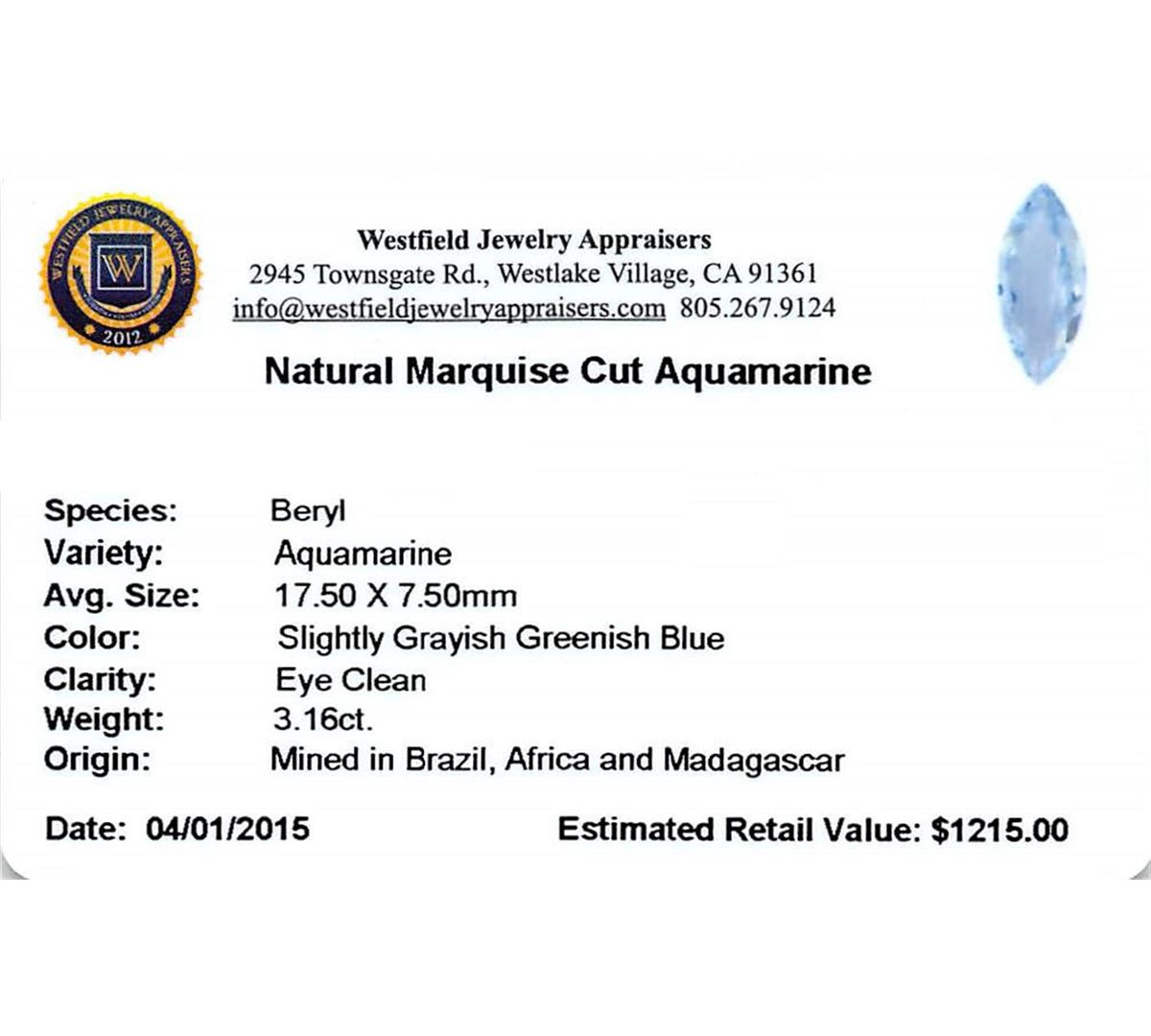 One marquise cut natural aquamarine exact weight 3.16ct., type I, medium, slightly grayish, very slightly greenish blue color, (GIA vslgB 5/2), cut is good. Westfield Appraised at $1,215.00.