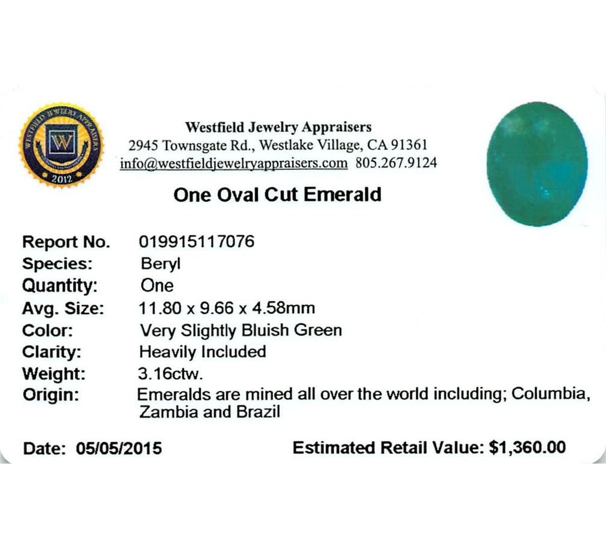 One oval mixed cut natural emerald, measuring 11.80 x 9.66 x 4.58mm, approximate weight of 3.16ct., clarity is heavily included, type III, medium, very slightly grayish, very slightly bluish green color, (GIA vslbG 5/3), cut is good. Indications of multiple laboratory enhancements, including high temperature heat treatment. Westfield Appraised at $1,360.00.