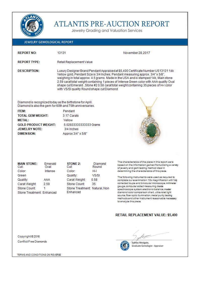 REF-81M8H -13131 ---- 3.17 CTW Emerald & Diamond Pendant 14K Yellow Gold ---- Luxury Designer Brand Pendant Appraised at $5,400 Certificate Number US13131 14k Yellow gold, Pendant Size is 3/4 Inches, Pendant measuring approx. 3/4" x 5/8", weighing in total approx. 4.5 grams. Made in the USA and is stamped 14k, Main stone 2.59 carat total weight containing 1 pieces of Intense Green color with AAA quality Oval shape cut Emerald , Stone #2 0.58 carat total weight containing 35 pieces of H-I color with VS/SI quality Round shape cut Diamond
