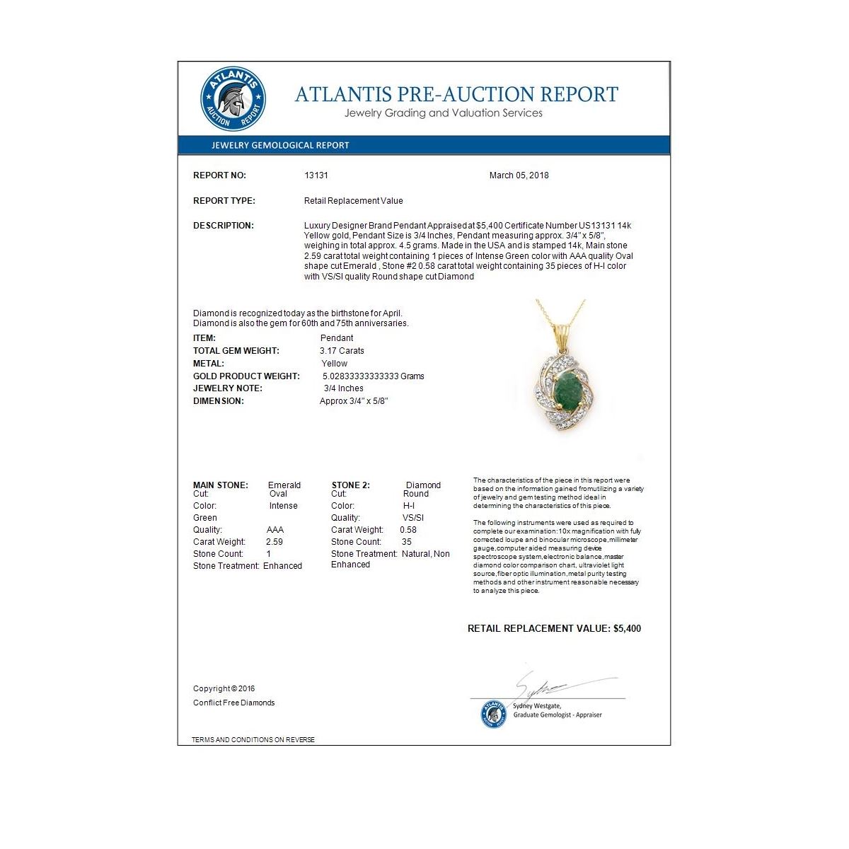 REF-81M8H -13131 ---- 3.17 CTW Emerald & Diamond Pendant 14K Yellow Gold ---- Luxury Designer Brand Pendant Appraised at $5,400 Certificate Number US13131 14k Yellow gold, Pendant Size is 3/4 Inches, Pendant measuring approx. 3/4" x 5/8", weighing in total approx. 4.5 grams. Made in the USA and is stamped 14k, Main stone 2.59 carat total weight containing 1 pieces of Intense Green color with AAA quality Oval shape cut Emerald , Stone #2 0.58 carat total weight containing 35 pieces of H-I color with VS/SI quality Round shape cut Diamond