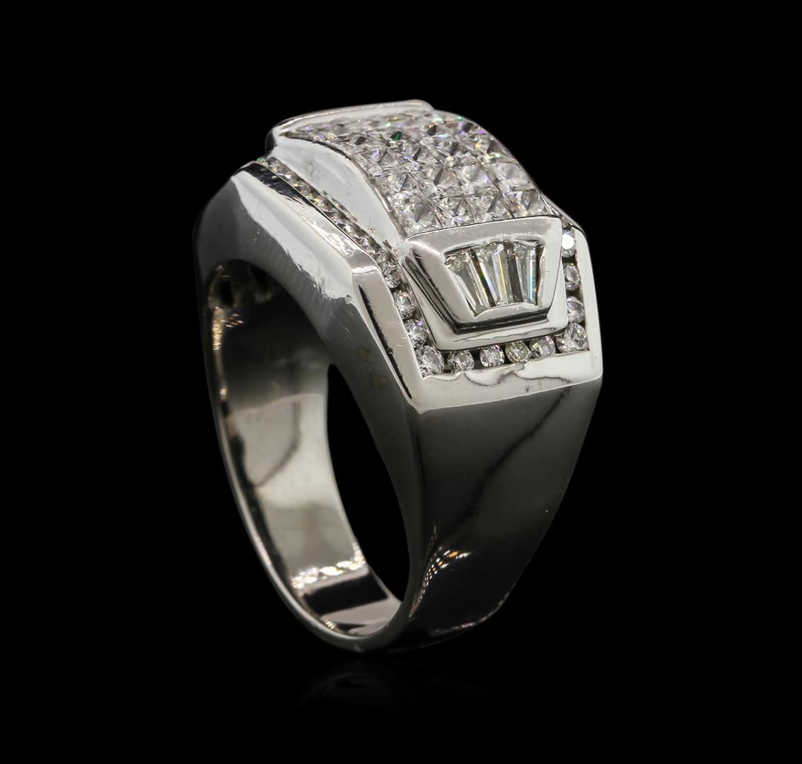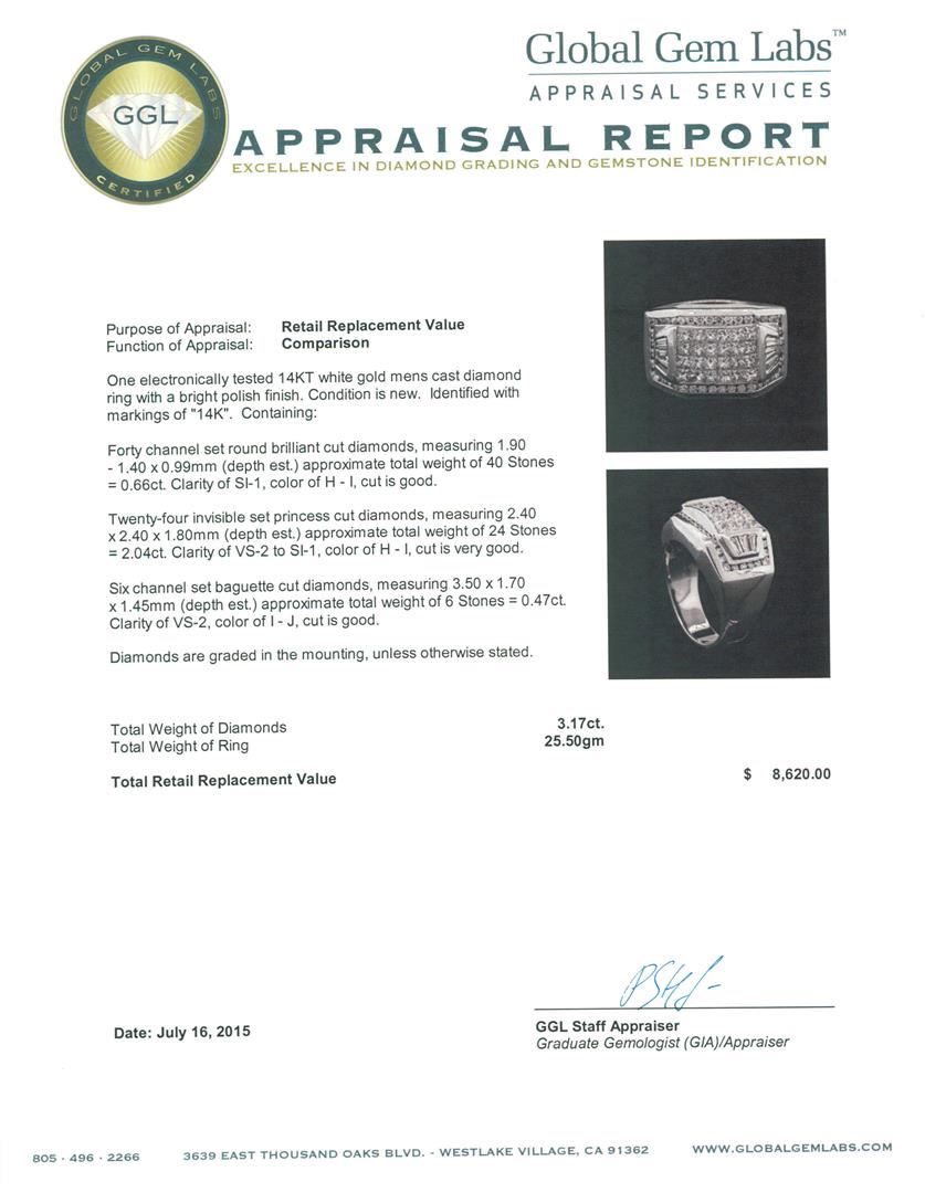 One electronically tested 14KT white gold mens cast diamond ring with a bright polish finish. Identified with markings of "14K". Condition is new. Containing: Forty channel set round brilliant cut diamonds, measuring 1.90 - 1.40 x 0.99mm (depth est.) approximate total weight of 40 Stones = 0.66ct. Clarity: SI-1. Color: H - I, Cut is Good. Twenty-Four invisible set princess cut diamonds, measuring 2.40 x 2.40 x 1.80mm (depth est.) approximate total weight of 24 Stones = 2.04ct. Clarity: VS-2 to SI-1. Color: H - I, Cut is Very Good. Six channel set baguette cut diamonds, measuring 3.50 x 1.70 x 1.45mm (depth est.) approximate total weight of 6 Stones = 0.47ct. Clarity: VS-2. Color: I - J, Cut is Good. Diamonds are graded in the mounting, unless otherwise stated. Total Weight of Diamonds 3.17ct. Total Weight of Ring 25.50 grams. GGL Appraised at $8,620.00.