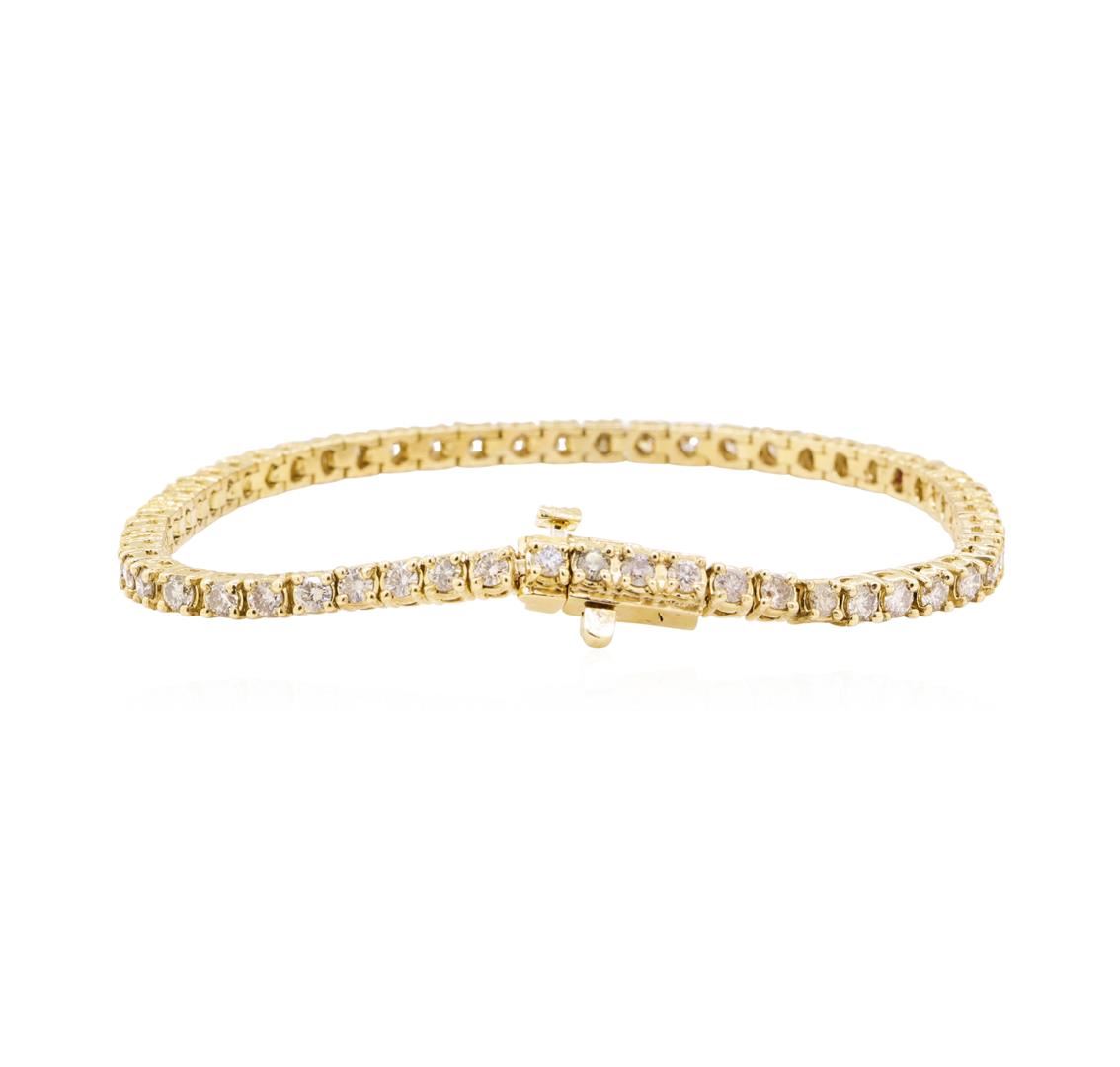 One electronically tested 14KT yellow gold lady's combination cast & assembled fashion tennis bracelet with a tongue clasp with foldover safety with a bright polish finish. The featured lady's bracelet measures approximately seven inches in length. Identified with markings of '14K'. Condition is new, good workmanship. Containing: Fifty-Seven prong set round brilliant cut diamonds, measuring 2.50 - 2.40 x 1.52mm (depth est.) approximate total weight of 57 Stones = 3.17ct. Graded in the setting. Color J - K Clarity SI-1 to I-1 Cut Good. Total Weight of Diamonds 3.17ct.. Total Weight of Tennis Bracelet 12.00gm GAS Appraised at $6565.00. GAS Appraised at $6,565.00.