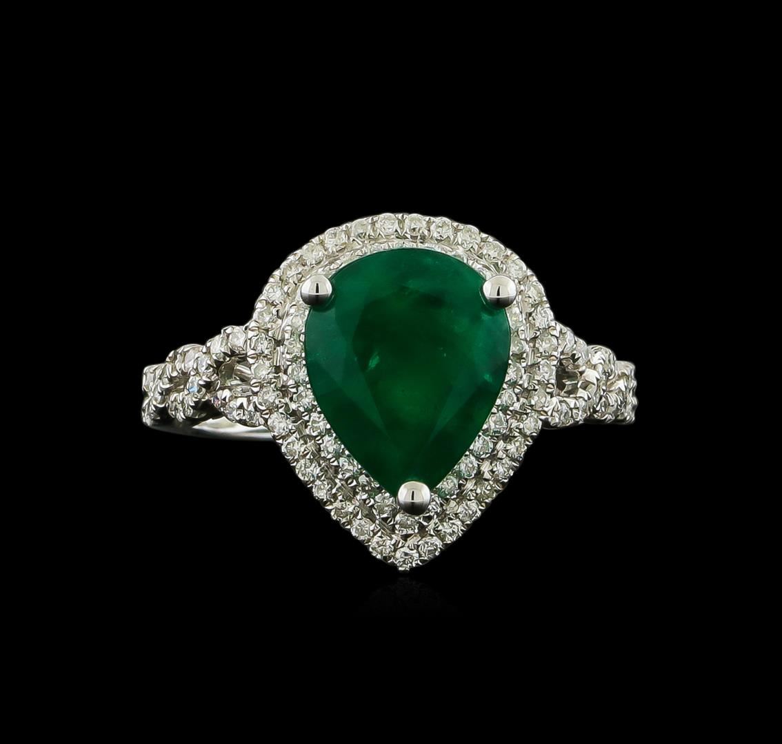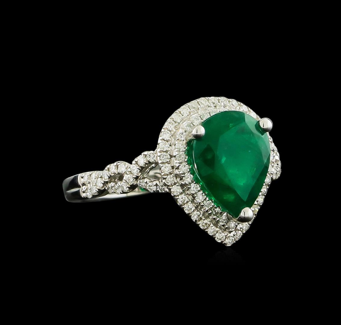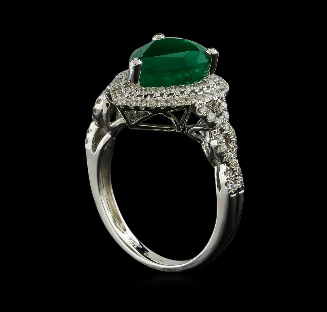 One electronically tested 18KT white gold lady's cast fashion ring with a basket double halo with a bright polish finish. The featured lady's ring has a shank measuring 2.40 millimeters wide. Identified with markings of "18K". Condition is new, good workmanship. Containing: One prong set pear modified brilliant cut natural emerald, measuring 11.00 x 8.80 x 5.83mm, 3%. bulge factor, approximate weight of 3.17ct., clarity is severely included, type III, dark, moderately strong, green color, (GIA G 7/4), cut is good. Transmitting light diffusely, opaque to translucent. Naturally occurring internal & external characteristics are present. Indications of oil residue. Graded in the setting. Ninety-Eight prong set round brilliant cut diamonds, measuring 1.20 - 1.10 x 0.69mm (depth est.) approximate total weight of 98 Stones = 0.50ct. Graded in the setting. Clarity: SI-1 to I-1. Color: G - Good. Total Weight of Colored Stones 3.17ct. Total Weight of Diamonds 0.50ct. Total Weight of Ring 4.80gm GAS Appraised at $5,735.00.