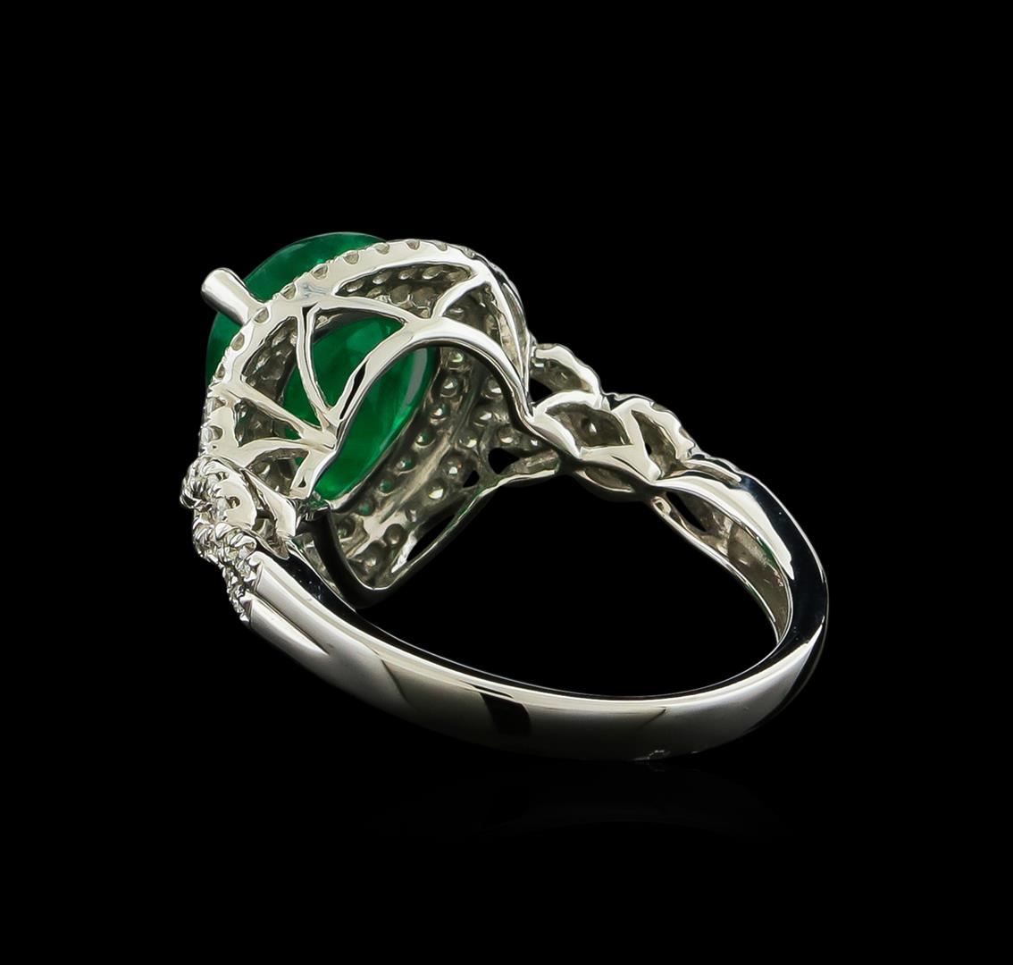 One electronically tested 18KT white gold lady's cast fashion ring with a basket double halo with a bright polish finish. The featured lady's ring has a shank measuring 2.40 millimeters wide. Identified with markings of "18K". Condition is new, good workmanship. Containing: One prong set pear modified brilliant cut natural emerald, measuring 11.00 x 8.80 x 5.83mm, 3%. bulge factor, approximate weight of 3.17ct., clarity is severely included, type III, dark, moderately strong, green color, (GIA G 7/4), cut is good. Transmitting light diffusely, opaque to translucent. Naturally occurring internal & external characteristics are present. Indications of oil residue. Graded in the setting. Ninety-Eight prong set round brilliant cut diamonds, measuring 1.20 - 1.10 x 0.69mm (depth est.) approximate total weight of 98 Stones = 0.50ct. Graded in the setting. Clarity: SI-1 to I-1. Color: G - Good. Total Weight of Colored Stones 3.17ct. Total Weight of Diamonds 0.50ct. Total Weight of Ring 4.80gm GAS Appraised at $5,735.00.