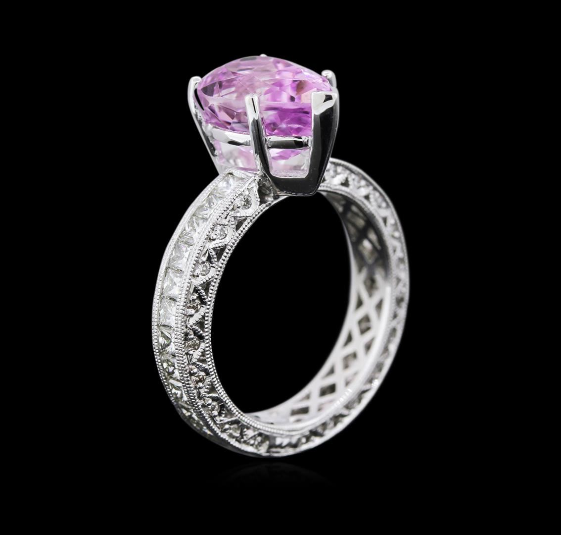 One electronically tested 14KT white gold ladies cast kunzite and diamond ring with a bright polish finish. Identified with markings of "14K". Condition is new. Containing: One prong set pear modified brilliant cut natural kunzite, measuring 12.00 x 8.00 x 5.20mm, approximate weight of 3.17ct., clarity is eye clean, type I, medium light, very slightly grayish, purple color, (GIA P 4/3), cut is very good. Thirty prong set round brilliant cut diamonds, measuring 1.00 - 1.00 x 0.60mm (depth est.) approximate total weight of 30 Stones = 0.11ct. Clarity: SI-2. Color: I - J, Cut is Good. Thirty channel set princess cut diamonds, measuring 2.00 x 2.00 x 1.50mm (depth est.) approximate total weight of 30 Stones = 1.48ct. Clarity: VS-2. Color: I - J, Cut is Good. Colored gemstones are presumed to have been subjected to commonly used enhancement processes. Diamonds are graded in the mounting, unless otherwise stated. Total Weight of Colored Stones 3.17ct. Total Weight of Diamonds 1.58ct. Total Weight of Ring 7.30gm. GGL Appraised at $4,115.00.