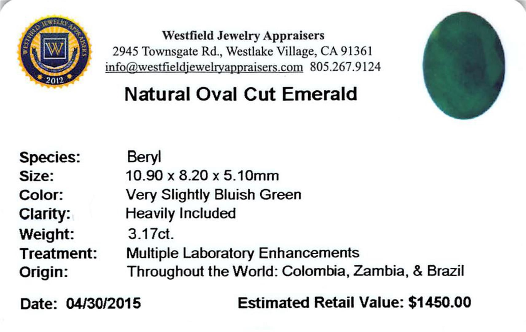 One oval cut natural emerald, measuring 10.90 x 8.20 x 5.10mm, exact weight 3.17ct., clarity is heavily included, type III, medium dark, very slightly grayish, very slightly bluish green color, (GIA vslbG 6/3), cut is good. Westfield Appraised at $1,450.00.
