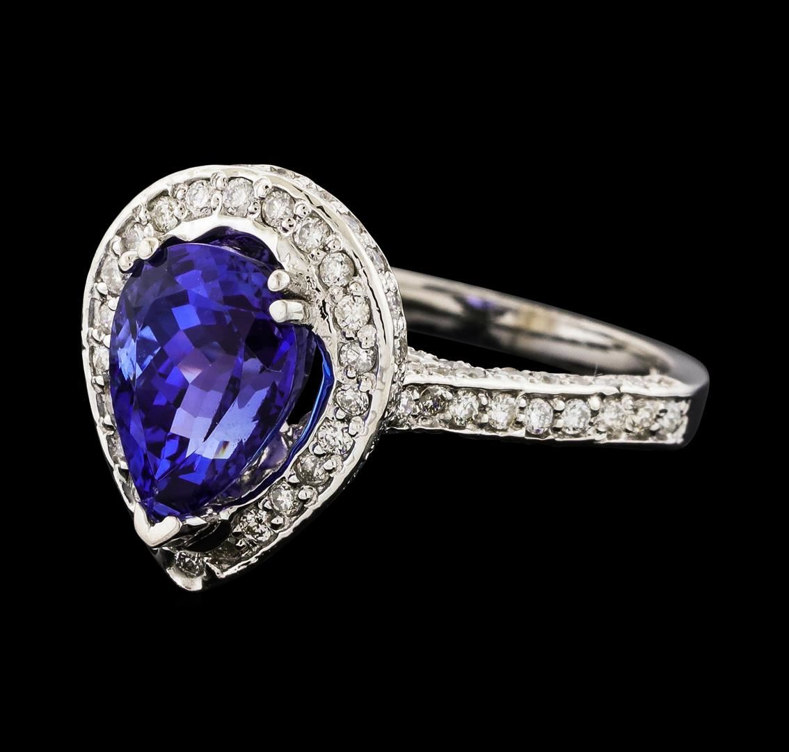 One electronically tested 14KT white gold lady's cast fashion ring with a cathedral shank with a basket halo with a bright polish finish. The featured lady's ring has a shank measuring 1.98 millimeters wide. Identified with markings of '14K'. Condition is new, good workmanship. Containing: One prong set pear modified brilliant cut natural tanzanite, measuring 10.05 x 7.18 x 6.60mm, (depth est.) approximate weight of 3.17ct., clarity is eye clean, medium dark, strong, violetish blue color, (GIA vB 6/5), cut is very good. Transmitting light with no distortion, transparent. Colored gemstones are presumed to have been subjected to commonly used enhancement processes. Graded in the setting. One Hundred Twenty-Nine prong set round brilliant cut diamonds, measuring 1.35 - 1.15 x 0.78mm (depth est.) approximate total weight of 129 Stones = 0.94ct. Graded in the setting. Clarity SI-1 to I-1. Color: G - I Cut Good. Total Weight of Colored Stones 3.17ct.. Total Weight of Diamonds 0.94ct.. Total Weight of Ring 5.00gm. GAS Appraised at $9,355.00.