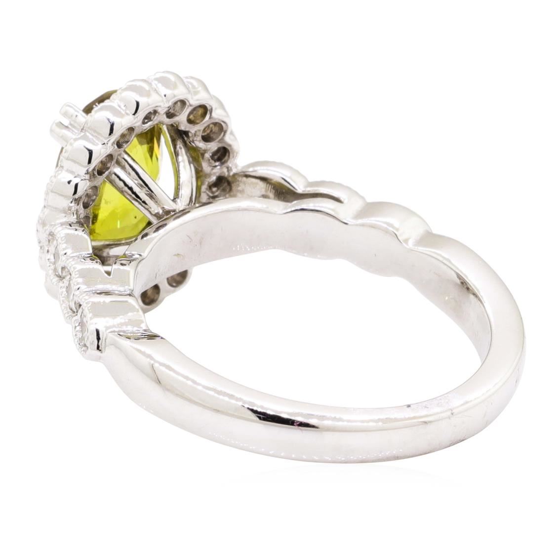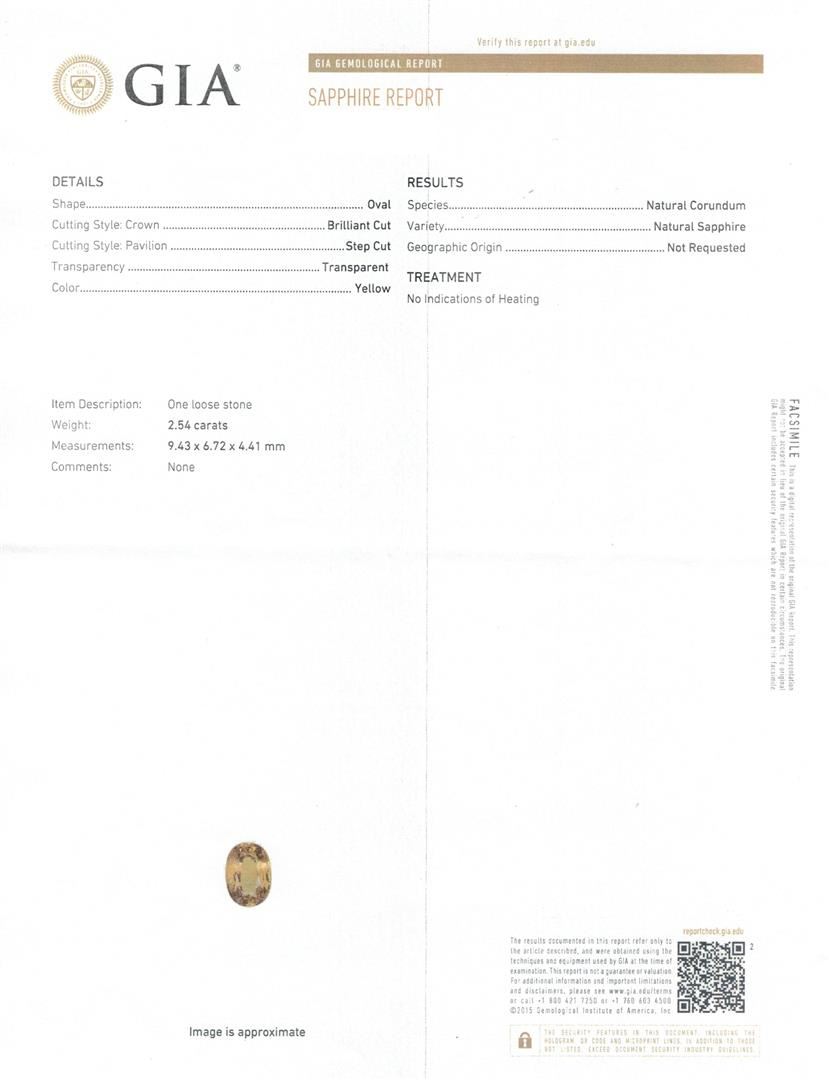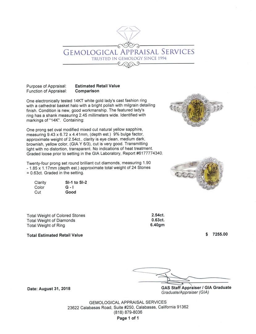 One electronically tested 14KT white gold lady's cast fashion ring with a cathedral basket halo with a bright polish with milgrain detailing finish. The featured lady's ring has a shank measuring 2.45 millimeters wide. Identified with markings of '14K'. Condition is new, good workmanship. Containing: One prong set oval modified mixed cut natural yellow sapphire, measuring 9.43 x 6.72 x 4.41mm, (depth est.) 9%. bulge factor, approximate weight of 2.54ct., clarity is eye clean, medium dark, brownish, yellow color, (GIA Y 6/3), cut is very good. Transmitting light with no distortion, transparent. No indications of heat treatment. Graded loose prior to setting in the GIA Laboratory, Report #6177774340. Twenty-Four prong set round brilliant cut diamonds, measuring 1.90 - 1.85 x 1.17mm (depth est.) approximate total weight of 24 Stones = 0.63ct. Graded in the setting. Color G - I Clarity SI-1 to SI-2 Cut Good. Total Weight of Colored Stones 2.54ct.. Total Weight of Diamonds 0.63ct.. Total Weight of Ring 6.40gm GAS Appraised at $7255.00. GAS Appraised at $7,255.00.