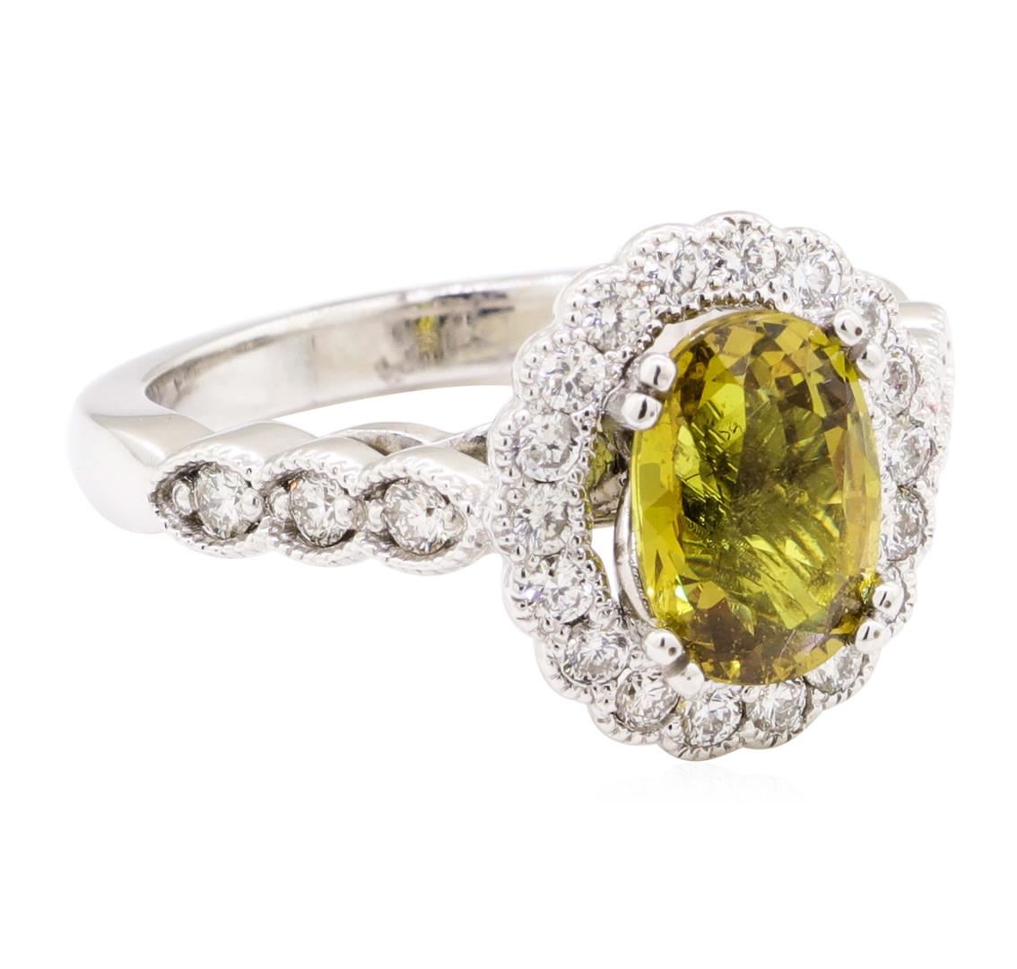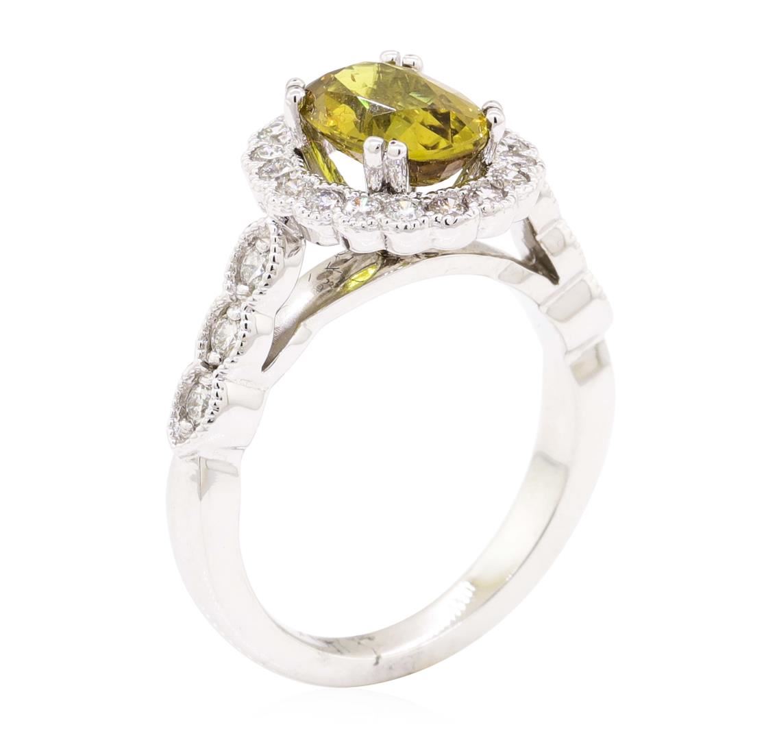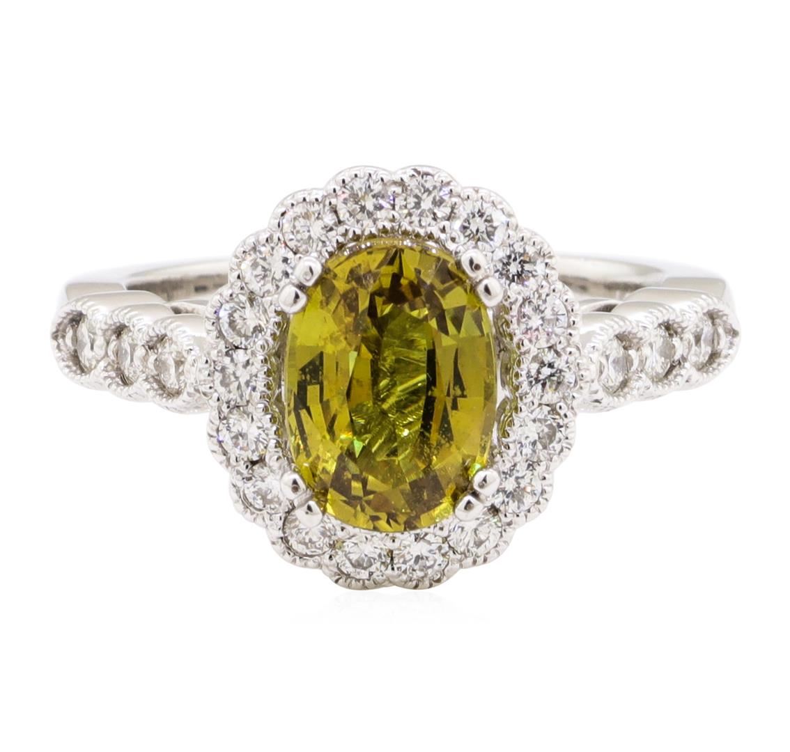 One electronically tested 14KT white gold lady's cast fashion ring with a cathedral basket halo with a bright polish with milgrain detailing finish. The featured lady's ring has a shank measuring 2.45 millimeters wide. Identified with markings of '14K'. Condition is new, good workmanship. Containing: One prong set oval modified mixed cut natural yellow sapphire, measuring 9.43 x 6.72 x 4.41mm, (depth est.) 9%. bulge factor, approximate weight of 2.54ct., clarity is eye clean, medium dark, brownish, yellow color, (GIA Y 6/3), cut is very good. Transmitting light with no distortion, transparent. No indications of heat treatment. Graded loose prior to setting in the GIA Laboratory, Report #6177774340. Twenty-Four prong set round brilliant cut diamonds, measuring 1.90 - 1.85 x 1.17mm (depth est.) approximate total weight of 24 Stones = 0.63ct. Graded in the setting. Color G - I Clarity SI-1 to SI-2 Cut Good. Total Weight of Colored Stones 2.54ct.. Total Weight of Diamonds 0.63ct.. Total Weight of Ring 6.40gm GAS Appraised at $7255.00. GAS Appraised at $7,255.00.