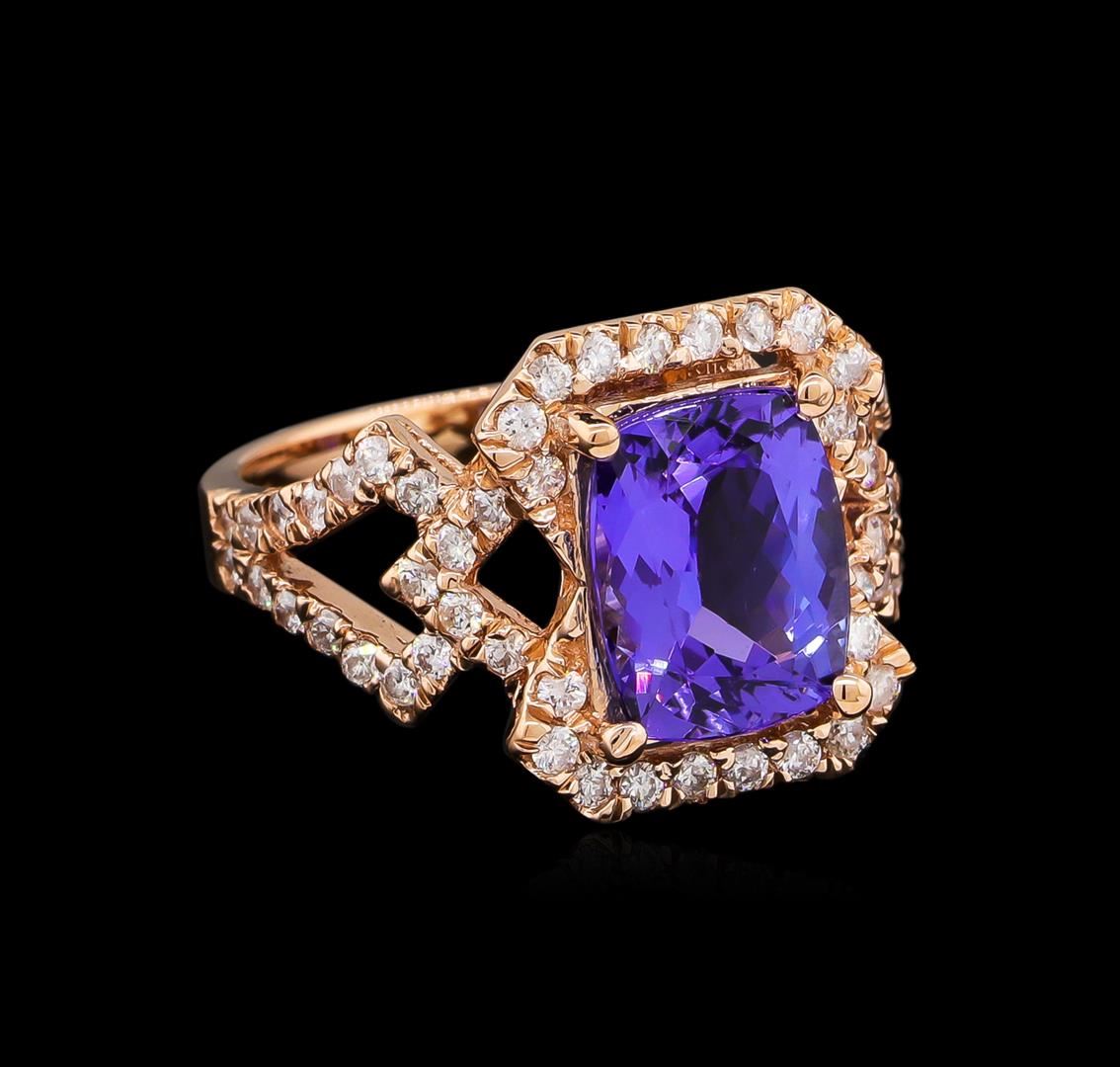 One electronically tested 14KT rose gold lady's cast fashion ring with a split shank with a bright polish finish. The featured lady's ring has a shank measuring 2.45 millimeters wide. Identified with markings of "K14". Condition is new, good workmanship. Containing: One prong set rectangular cushion modified brilliant cut natural tanzanite, measuring 9.98 x 7.94 x 5.01mm, approximate weight of 3.17ct., clarity is eye clean, type I, medium light, moderately strong, bluish violet color, (GIA bV 4/4), cut is very good. Transmitting light with no distortion, transparent. Colored gemstones are presumed to have been subjected to commonly used enhancement processes. Graded in the setting. Fifty-Eight prong set round brilliant cut diamonds, measuring 1.50 - 1.40 x 0.90mm (depth est.) approximate total weight of 58 Stones = 0.68ct. Graded in the setting. Clarity: SI-1 to I-1. Color: H - I. Cut Good. Total Weight of Colored Stones 3.17ct. Total Weight of Diamonds 0.68ct. Total Weight of Ring 5.70gm. GAS Appraised at $6,860.00.