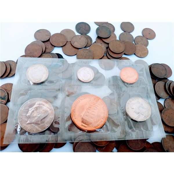 156 Wheat Pennies from 1909 and up. I uncirculated Denver Mint 1987 coin set. Various Dates, mint marks and grades.