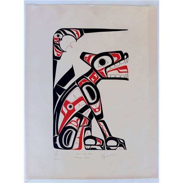 Roy H Vickers Silk Screen Art titled "Wolf and Moon" Signed Roy H Vickers Tsimsian Design # 55 of 150. Framed. 23" H x 17.5" W...