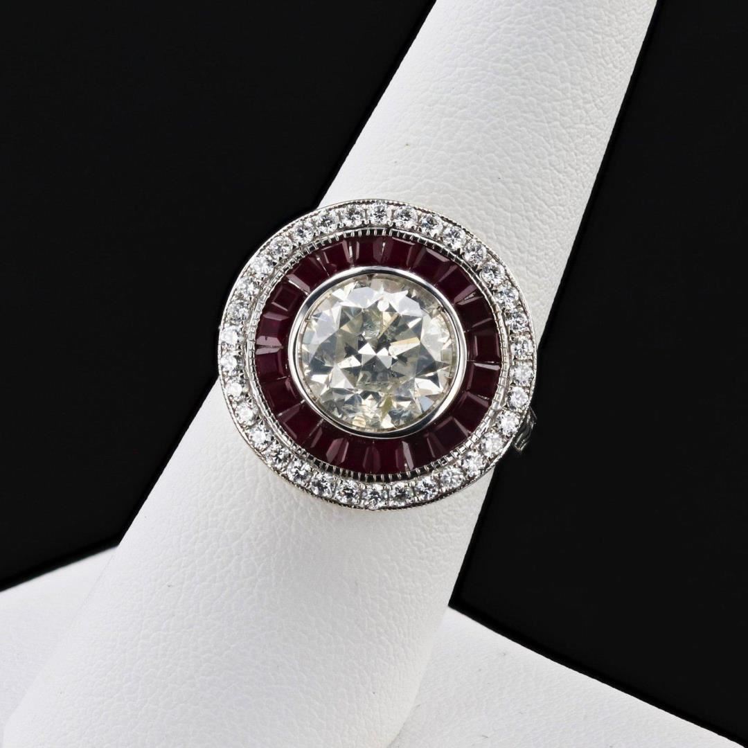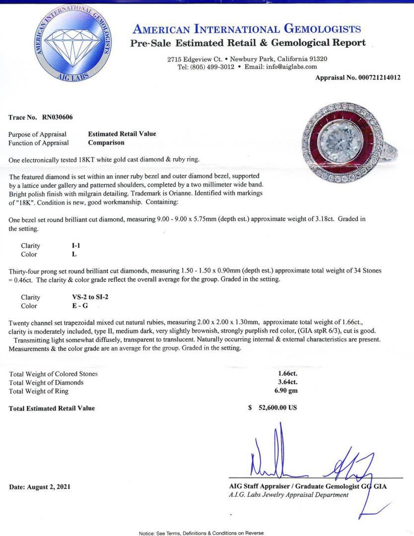 One electronically tested I8KT white gold cast diamond & ruby ring. The featured diamond is set within an inner ruby bezel and outer diamond bezel, supported by a lattice under gallery and patterned shoulders, completed by a two millimeter wide band. Bright polish finish with milgrain detailing. Trademark is Orianne. Identified with markings of "18K". Condition is new, good workmanship. One bezel set round brilliant cut diamond, measuring 9.00 - 9.00 x 5.75mm (depth est.) approximate weight of 3.18ct. Graded in the setting. Clarity: I-1 Color: L Thirty-four prong set round brilliant cut diamonds, measuring 1.50 - 1.50 x 0.90mm (depth est.) approximate total weight of 34 Stones = 0.46ct. The clarity & color grade reflect the overall average for the group. Graded in the setting. Clarity: VS-2 to SI-2 Color: E - G Twenty channel set trapezoidal mixed cut natural rubies, measuring 2.00 x 2.00 x 1.30mm, approximate total weight of 1.66ct., clarity is moderately included, type II, medium dark, very slightly brownish, strongly purplish red color, (GIA stpR 6/3), cut is good. Transmitting light somewhat diffusely, transparent to translucent. Naturally occurring internal & external characteristics are present. Measurements & the color grade are an average for the group. Graded in the setting. Size: 6.75